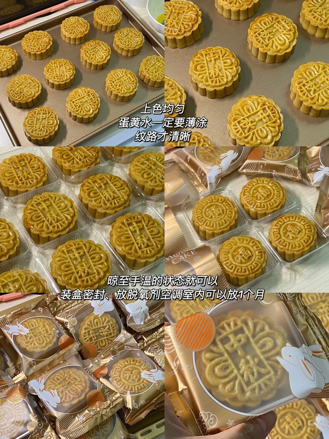 🥮上色均匀,蛋黄水一定要薄涂,月饼的纹路才清晰,晾至手温的状态就可以装盒密封,放脱氧剂空调室内可以存放一个月左右。