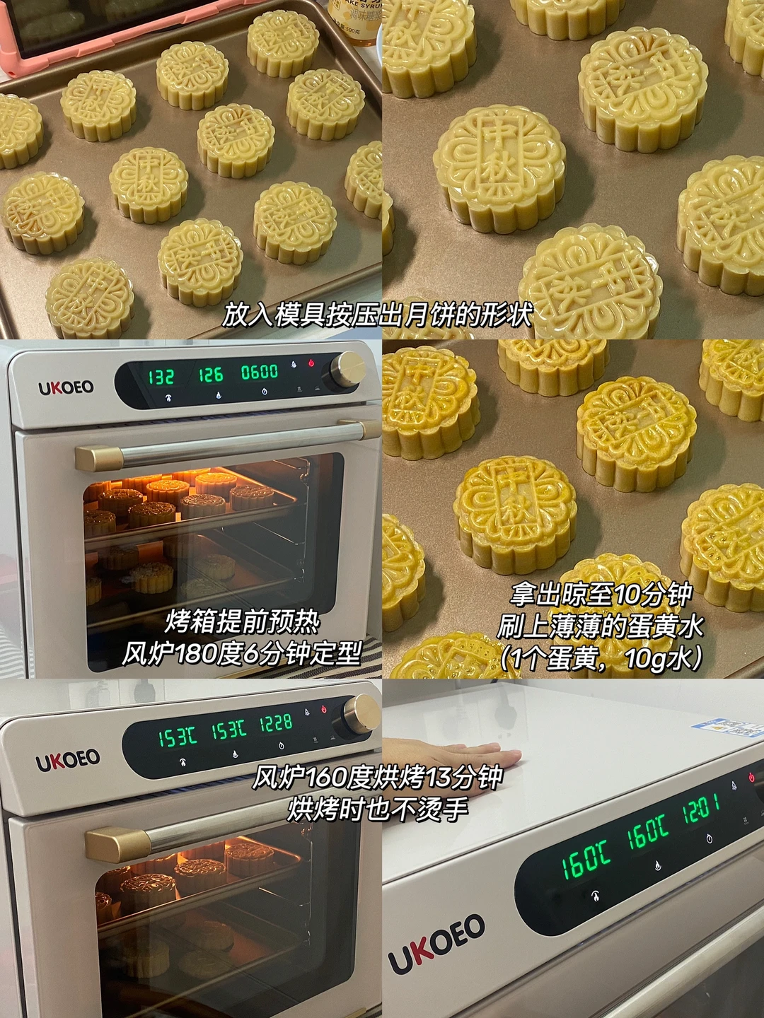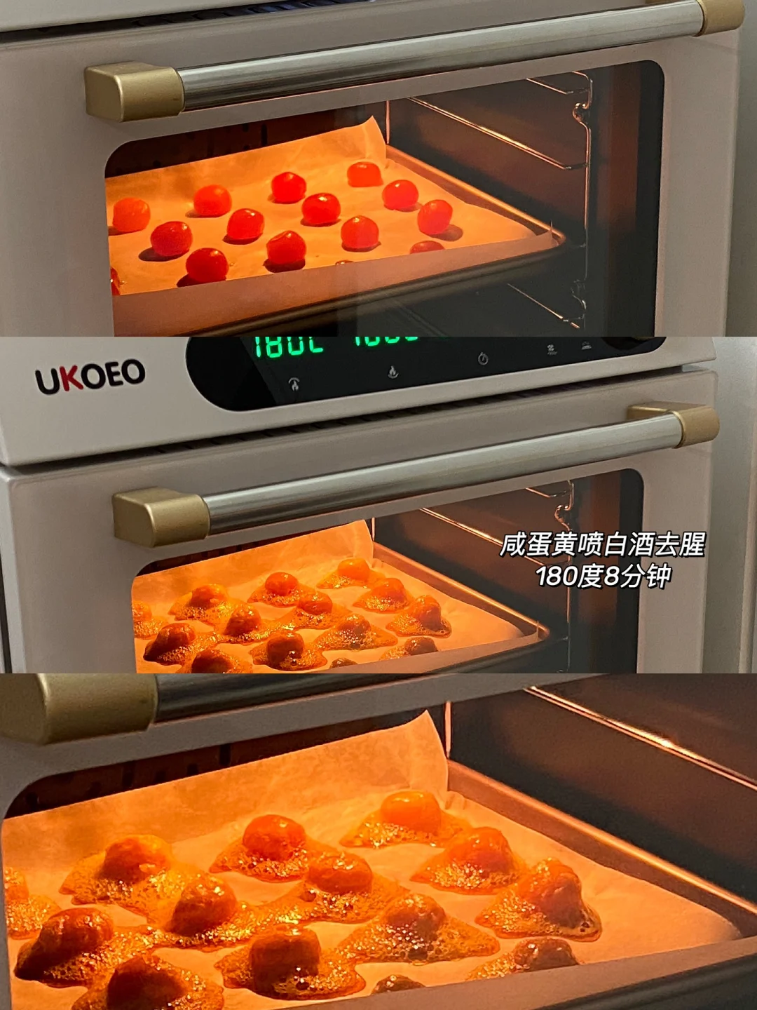 🥮做法:1.咸蛋黄清洗干净,喷白酒去腥,180度烘烤8分钟烤熟备用。