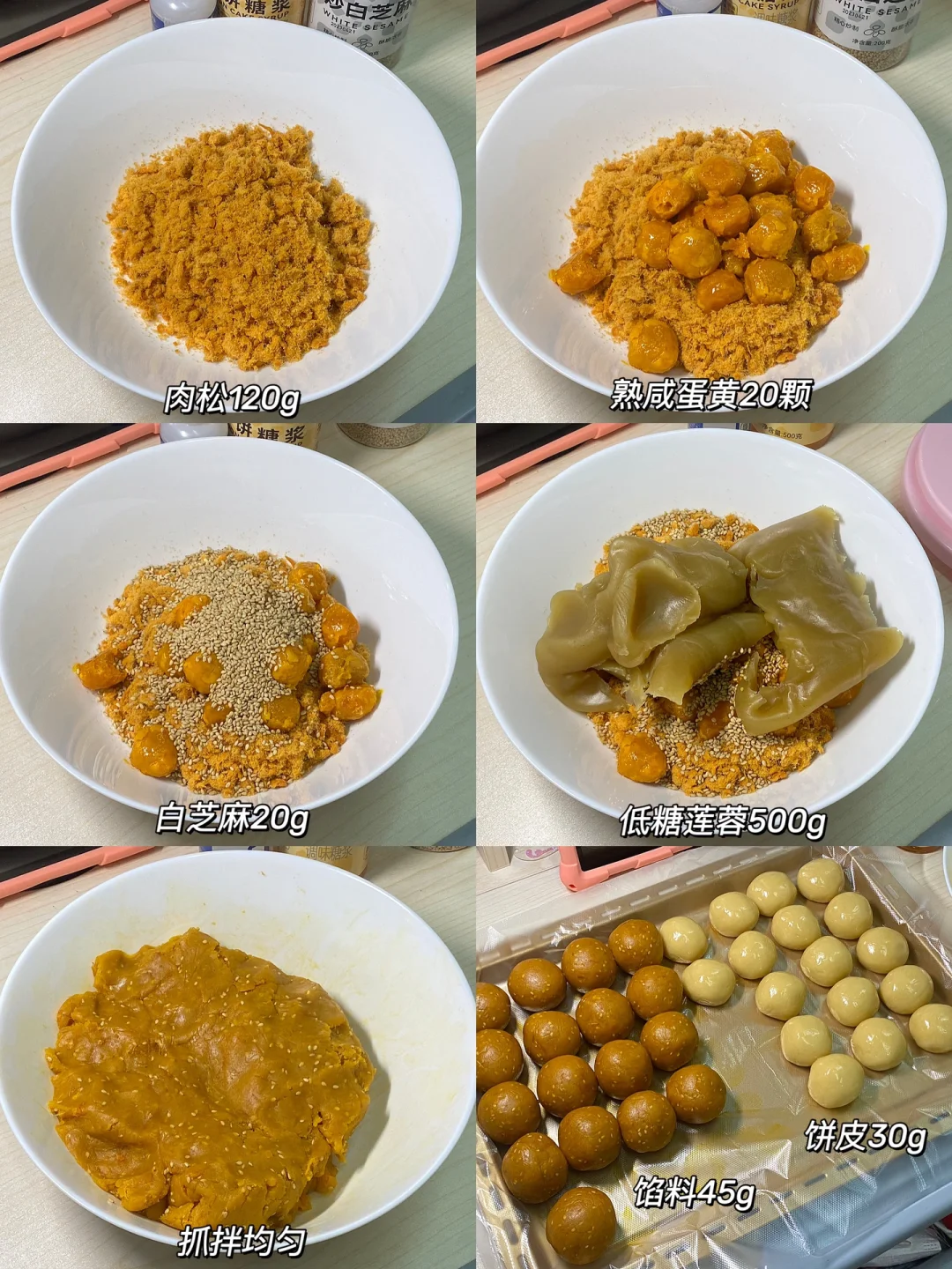 🥮馅料食材:肉松120g,咸蛋黄20个,熟芝麻20g,低糖白莲蓉500g。
