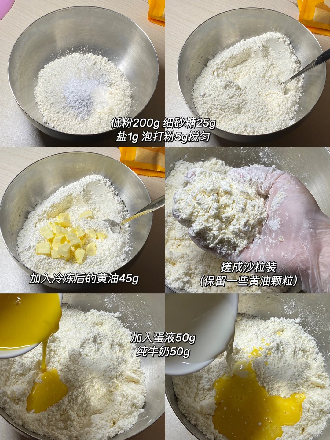 🌷食材:低粉200g,盐1g,细砂糖25g(不建议再减糖了)泡打粉5g,冷冻黄油45g,鸡蛋液50g,纯牛奶50g。