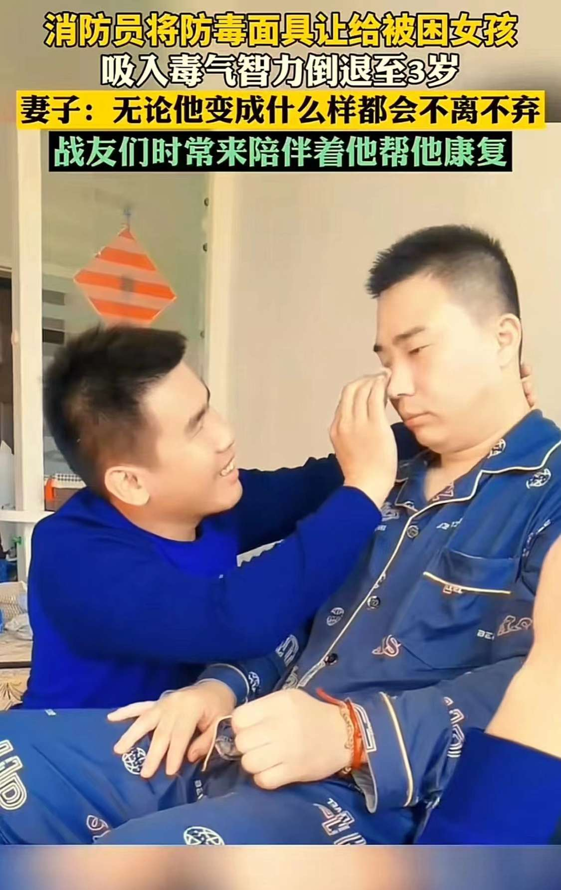 “这个消防员火了!”河北沧州,消防员将防毒面具让给被困女孩,导致自己吸入混合气体中毒,智力倒退至3岁,生活不能自理!妻子:他是英雄,但我更希望他能健康!我从心里接受不了,到后来心里慢慢接受!无论他以后会变成什么样子,都会不离不弃!