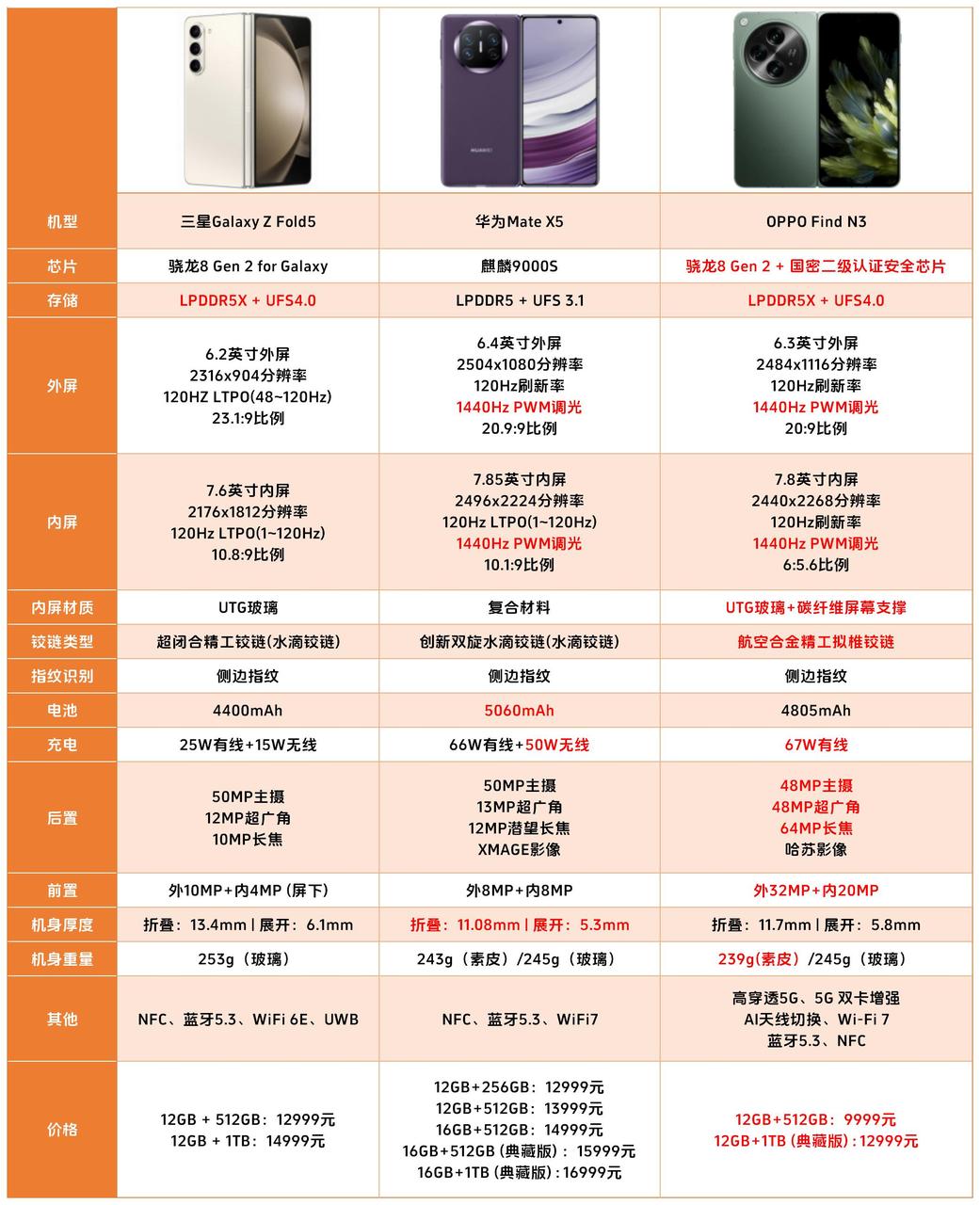 线下摸了Mate X5,终于知道为啥很多人说折叠屏只分“华为和其他”,这做工太绝了,拿在手里那种轻薄感,在那些250克甚至300克的机子上根本体验不到,而且大屏适配真心不赖,想想有些厂商居然在大折叠上卷性能,确实有点本末倒置了,建议多向X5学学。 我还去上手了Find N3,感觉这句话要改改了,应该是只分“华为、OPPO和其它”,三星做工也不赖,但是个人不太喜欢它的拍照,OPPO这款影像就很强,给了折叠屏最强三摄,尤其喜欢它的长焦,感觉能和很多直板旗舰拼一拼了,而且屏幕的观感很赞,2800nit亮度,这么精致的一块大屏放在你面前,谁能不心动? Find N3的全景虚拟屏也蛮有意思的,三个APP全尺寸分屏,但是多余的部分就放虚拟屏里,一点不影响操作,反而还提高了大屏效率,平时拿来做旅游攻略或者看比赛聊天就很实用,这一点我说句实话,比华为三星的分屏好用,而且同512GB价格还便宜了三四千,蛮有诚意的,我打算入一个玩玩。 #OPPO Find N3#
