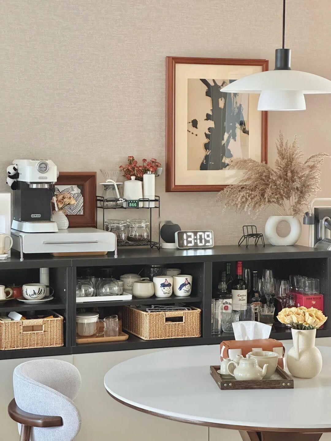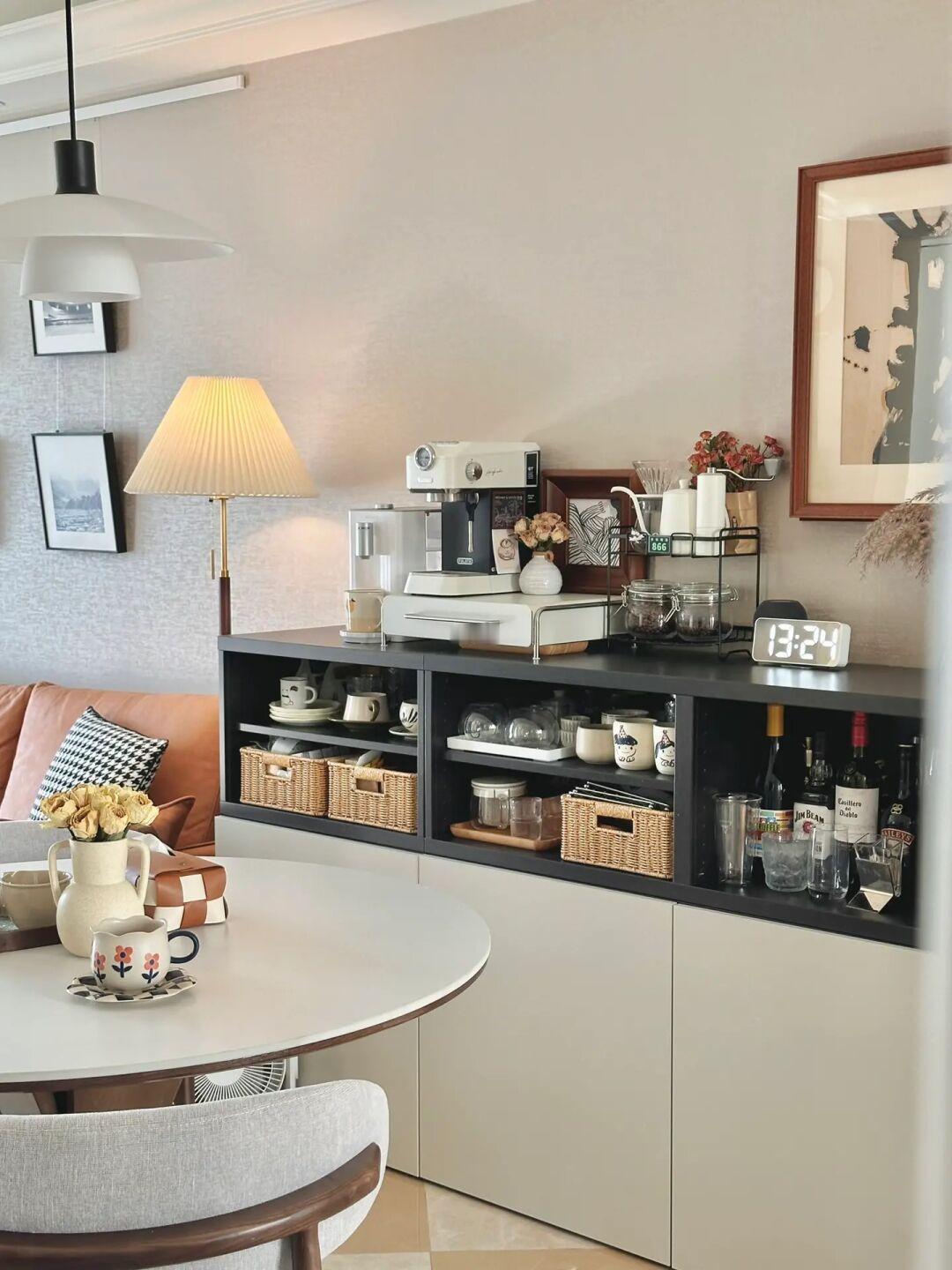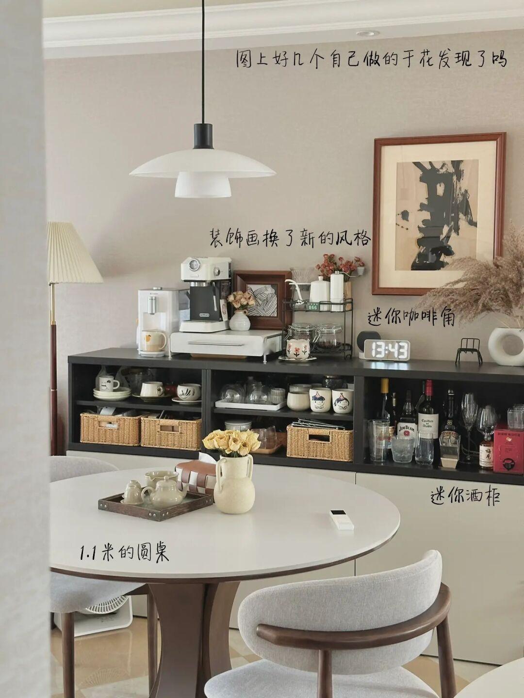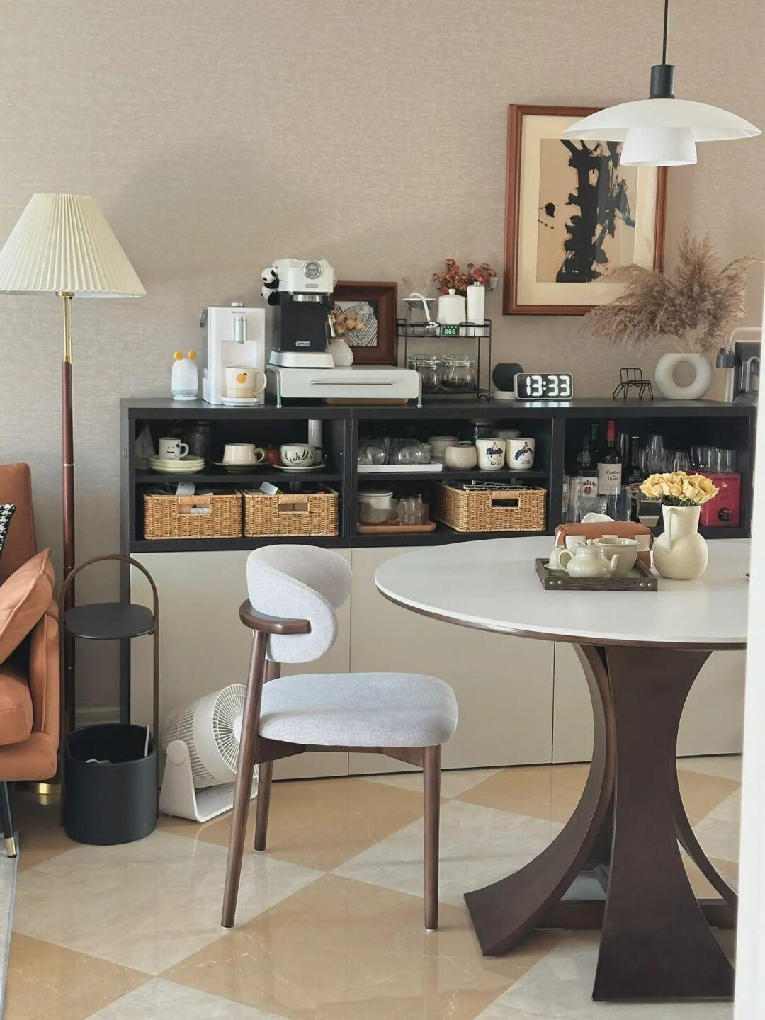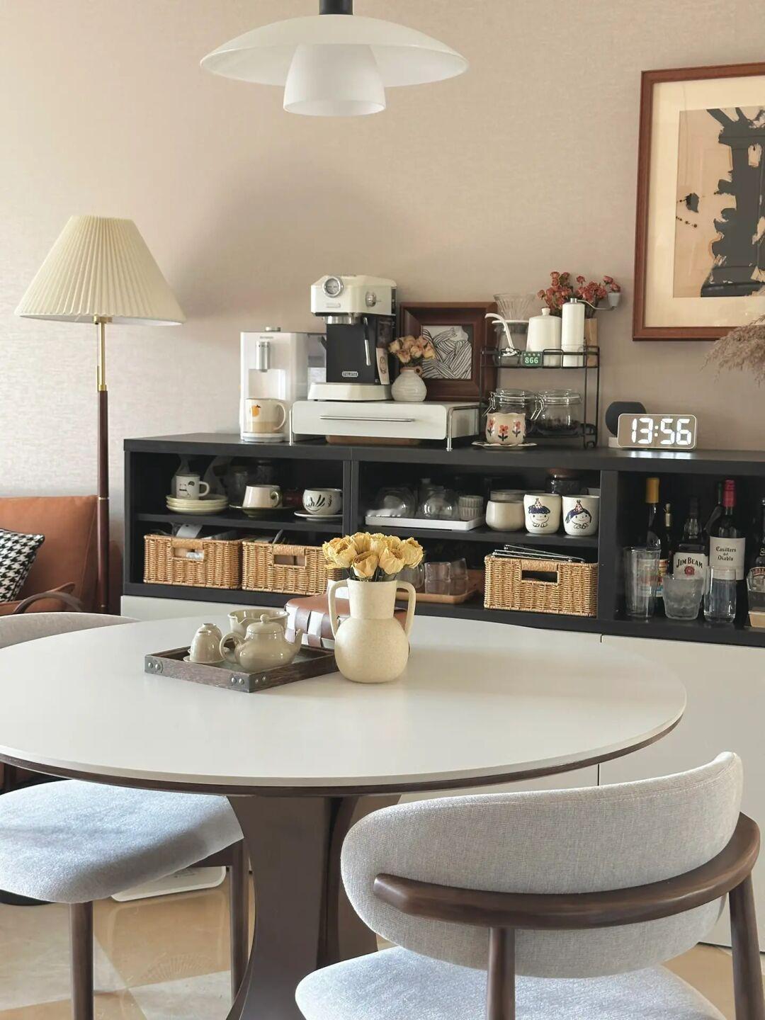 搭配1.8米长的餐边柜+1.1米直径的白色岩板圆桌,