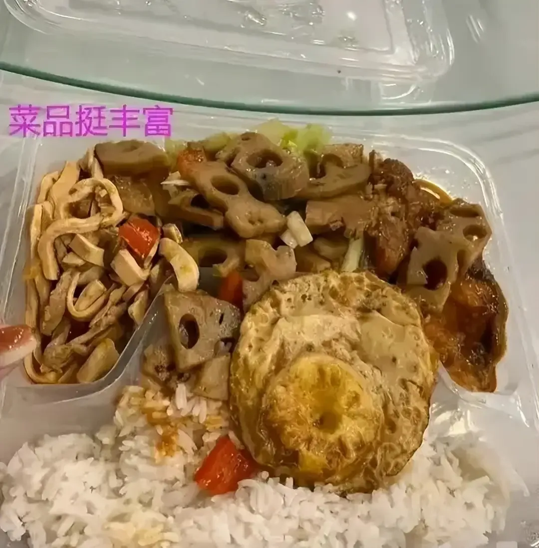 盒饭就盒饭,还是最低档的盒饭。。。这是10块钱一盒的吧?还是零售价!她这算大量采购了,可能六七块钱一盒!