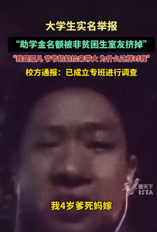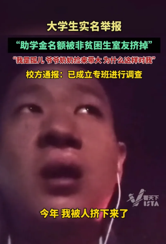 没看到,这个学生是建档立卡的贫困生,这是国家规定必然占一个助学金的名额的,这都被挤掉了。你还要学校去摸这个底,摸那个底,想多了吧