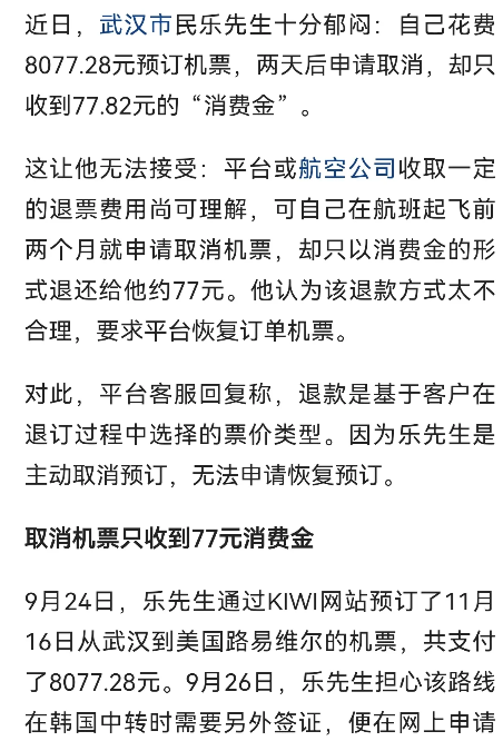 “吃个哑巴亏?”湖北武汉,一男子支付8077.28元预定了一张飞往国外的机票,两天后取消了订单,万万没想到,平台只退给男子77.28元抵用金,两年内在平台消费有用。男子傻眼了:你们没有告诉我取消订单不退款,我还能不能恢复预定?对方给出的说法让男子欲哭无泪。