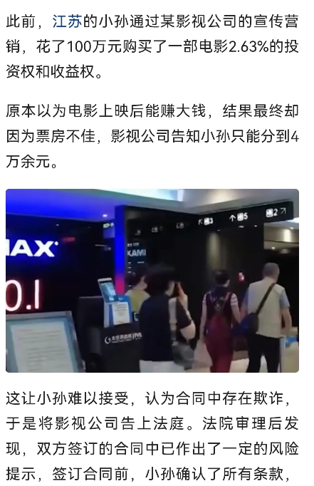 “自认倒霉?”江苏无锡,一男子花100万元认筹了某电影2.63%的投资份额,原本以为会大赚一笔,万万没想到,电影票房不佳,男子只能分得4万元。男子不服,以合同欺诈为由,将影视公司告上法庭,要求确认这个合同是没有相应的法律效力的,法院的判决结果却给出了不同看法。