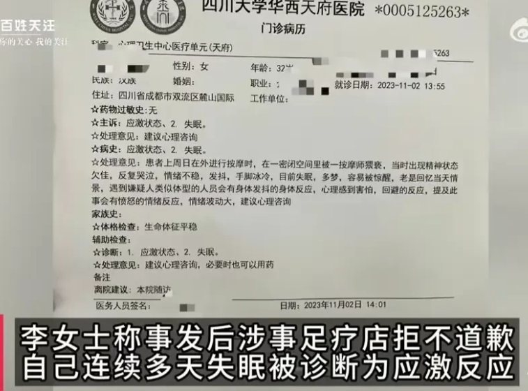 四川成都,一女子到足浴店按摩时,一名男技师为其提供按摩服务。过程中,男技师以可治疗宫寒为由,解下女子内衣并触摸其隐私部位,后又继续趁机脱下其内裤。女子报警后男技师被拘留7日。但足浴店负责人坚称,相信男技师的为人并拒绝道歉。
