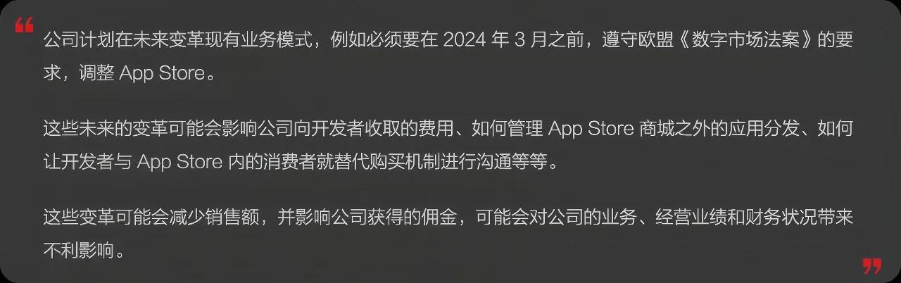 11 月 9 日消息,根据苹果公司递交的 10-K 文件内容,该公司预估从 2024 年开始在欧洲市场,将被迫支持运行第三方应用商城。 苹果公司此前出于安全等多方面的因素,试图游说欧盟支持 App Store,至少可以修改其中的某些重要部分,不过伴随着《数字市场法案》的落地,苹果在文件中坦言,针对欧洲市场的 App Store 调整是不可避免的。 翻译苹果 10-K 文件部分内容如下: