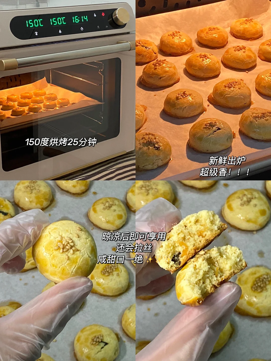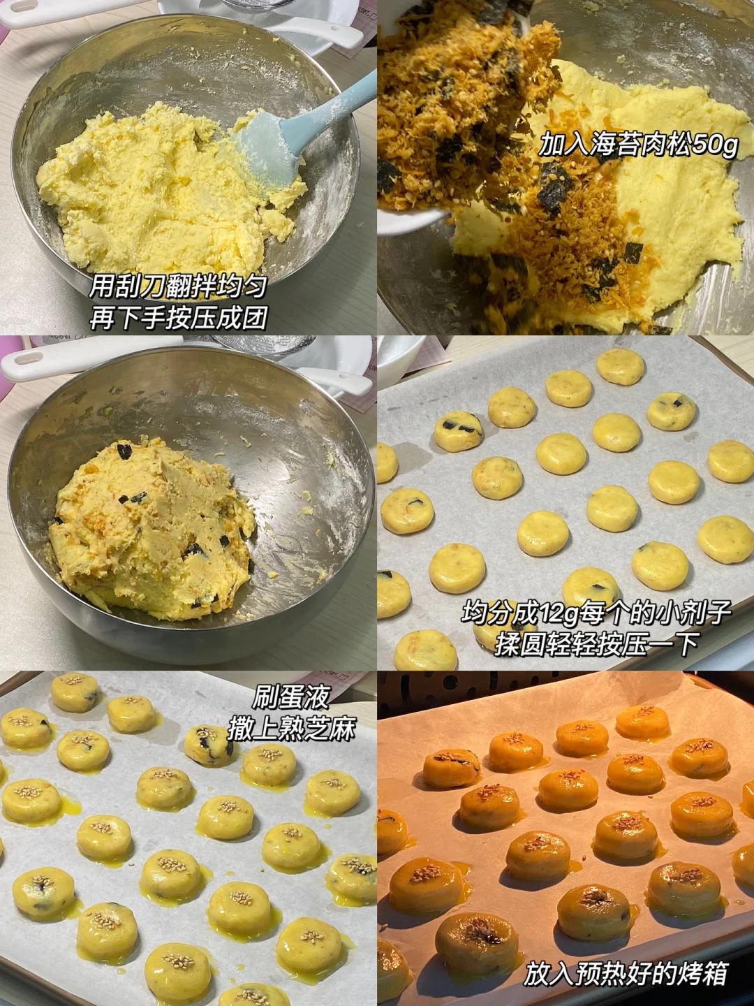🌷食材:黄油100g,细砂糖40g,低粉150g,奶粉50g,全蛋液60g,海苔肉松50g。 🌷做法:1.黄油室温软化,加入细砂糖用打蛋器打发至蓬松泛白。 2.分三次加入全蛋液,过筛低粉、奶粉,先用刮刀翻拌至看不到干粉,再下手按压成团,加入肉松,混合均匀。 3.均分成12g每个小剂子,揉圆,再轻轻按压一下,刷蛋液,撒上白芝麻。 4.放入提前预热好的烤箱,150度烘烤25分钟。 🌷出炉后晾凉,超级香!!! 🌷会拉丝的小曲奇,太太太好吃啦🤓