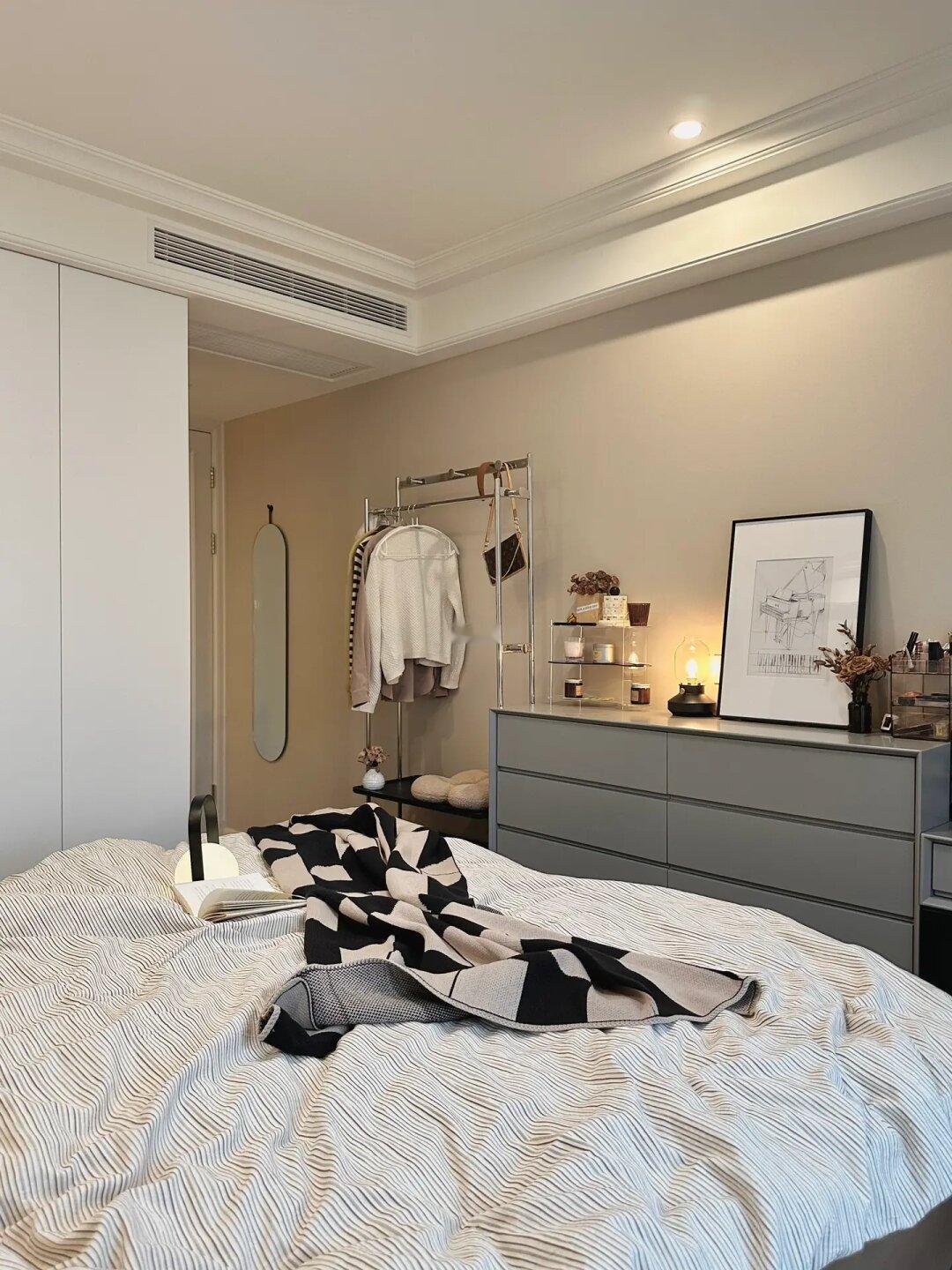 坐标杭州普通人的家🏠 滨江精装修交付,猪肝红地板和奶白色壁布均未拆~ 全靠软装搭配出了我的梦中情卧💗 趁着周末整个卧室来了个大换季~ 突然的降温和阴天真的宅家不想出门啊 | ⚪️关于布局: 飘窗柜+衣柜侧边柜+斗柜梳妆台的布局基本可以满足整个冬天的衣物收纳需求。房间虽小但是收纳真的💯 | ⚪️关于软装: 两个北方人真的很怕杭州的冬天 铺了鹅绒床垫整个身子下方都暖暖的, 床品、窗帘和飘窗垫这些布艺软装也都是暖色系搭配~ 哪怕是阴天视觉上也会让房间多一些温暖的感觉。