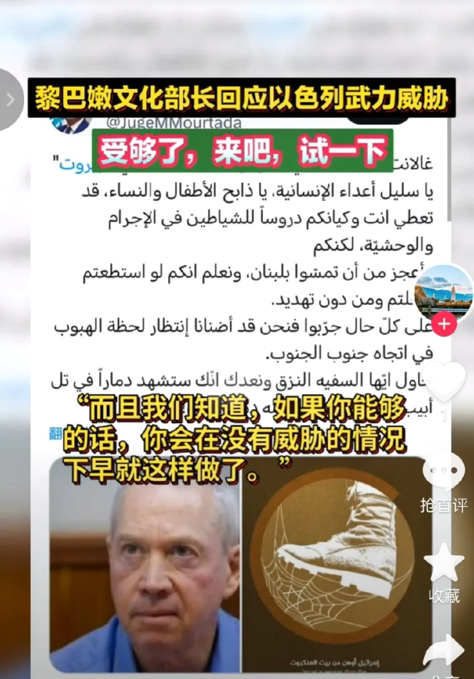 在以色列国防部长警告黎巴嫩,可以把加沙屠城的悲剧放到贝鲁特再做一次时,黎巴嫩文化部长回应了类似于元首的话语。他说以色列是人类的敌人,儿童妇女的屠杀者,以色列受到魔鬼的训练,但如果你们尝试一下对付加沙屠城的方式对付黎巴嫩,那就要毁灭以色列。这怕是二战后政治人物最接近元首的回答了。