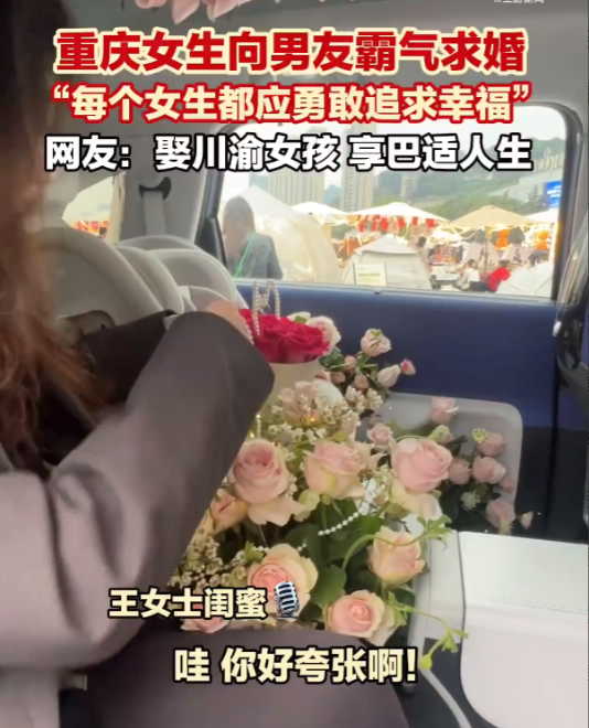 重庆,一女子为早日将自己嫁出去,她在车内布置了鲜花,甚至还准备了钻戒,然后在相恋两年的男友上车后,她主动向男友求婚了。事后女子表示:这个求婚仪式已谋划很久,谁求婚并不重要,遇到对的人,就一定要勇敢地去表达爱。