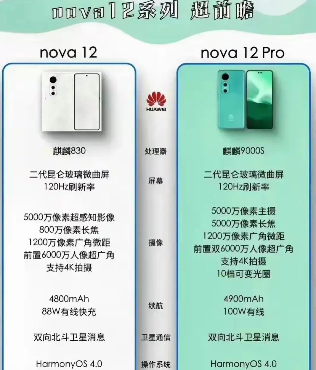 等惨了,华为nova12系列终于要来了,汇总一波最新爆料[捂脸] 1、首发麒麟830处理器,告别高通!性能肯定弱于麒麟9000s,出厂自带鸿蒙4.0。 2、有直屏版本,120Hz高刷,大概率也是京东方的OLED屏幕。 3、大量新技术下放,Mate60系列的二代昆仑玻璃、星闪技术、卫星通信、十档可变光圈有望下放到nova12系列。 4、4800mAh电池+88W超级快充。 5、据网上爆料,12月可能会发布,而且也有先锋计划提前开售。