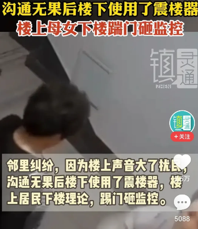 “无法无天!”一小区楼上声音非常大,楼下邻居便上门沟通,但是楼上邻居不听,随后楼下邻居安装了震楼器,万万没有想到,楼上邻居母子俩竟然下楼踹门砸监控。