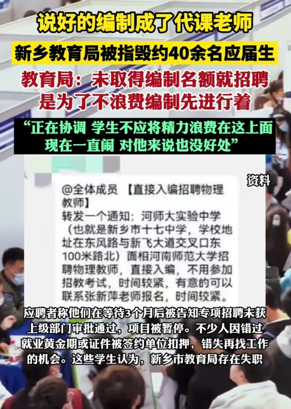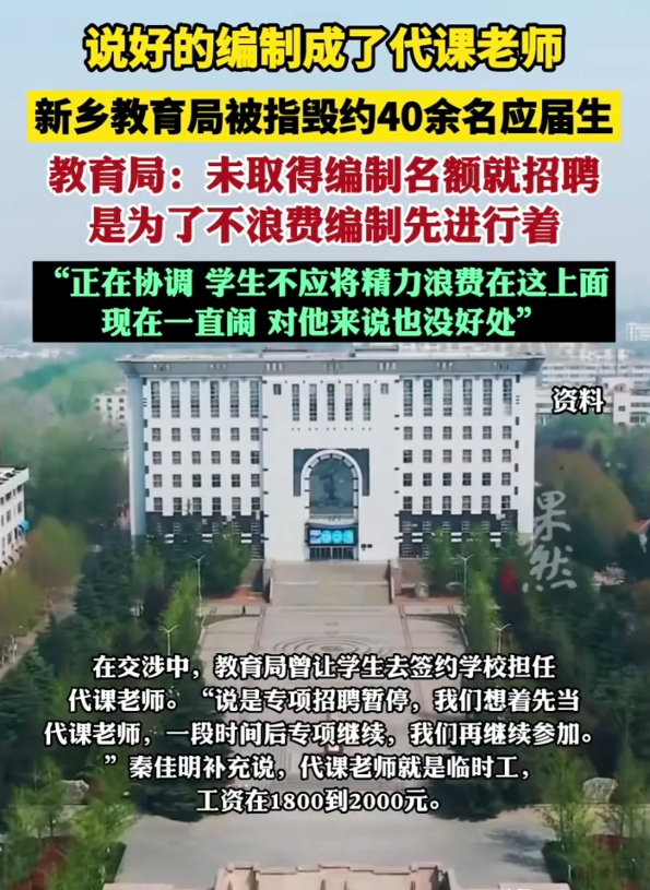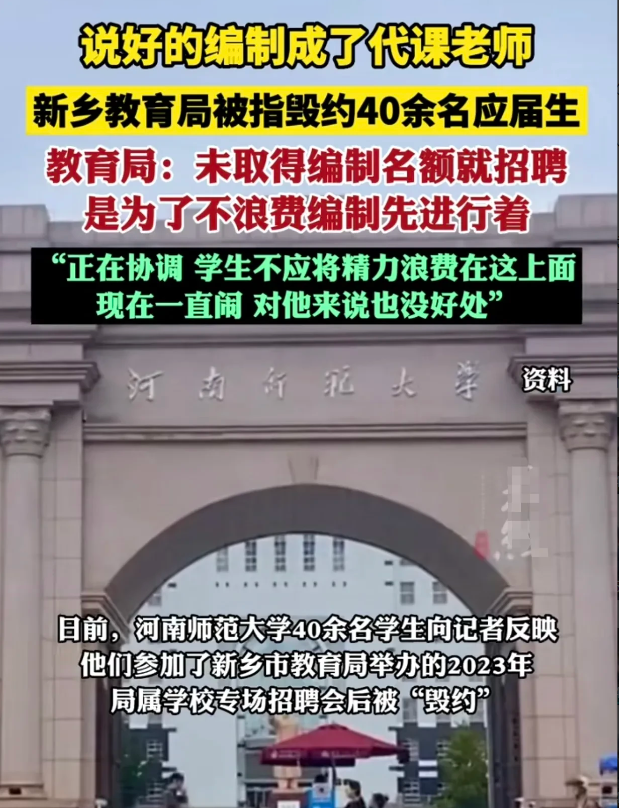 新乡市教育局这回出名了! 河南师范大学的40多名学生,和新乡市教育局签约,成为在编教师,结果突然变成了代课教师,原因是教育局还未取得编制名额就进行招聘! 但是这些毕业生慌了,原本说好的编制没了,变成了代课教师,一个月只有1800~2500的收入,教育局的工作人员进行了安抚,“学生不应该将精力浪费在这上面,现在一直闹,对他再说也没好处” 在这件事情中,吃亏最大的当然就是学生,白白浪费了自己应届生的身份,白白浪费了自己几个月的时间,结果是一出闹剧! 为什么一个教育局这么严肃的部门? 会出现这样的纰漏,会出现这样的失误,在还没有确定名额的情况下就进行招聘,到底是工作疏忽还是故意为之? 要知道在河南省能够考上河南师范大学的学生,都是非常优秀的,河南省本来就竞争激烈,人口众多,把这么多优秀的孩子给耽误了,谁来负这个责任? 我们不能如此的去对待人才,更不能如此对待我们的孩子,如果他们将来走上讲台之后,也在工作中频繁的出现漏洞,我们的国家,我们的社会,我们的教育,还能有希望吗?