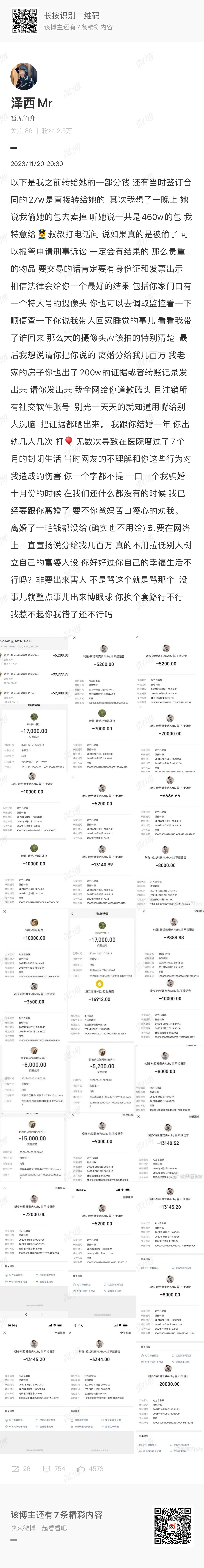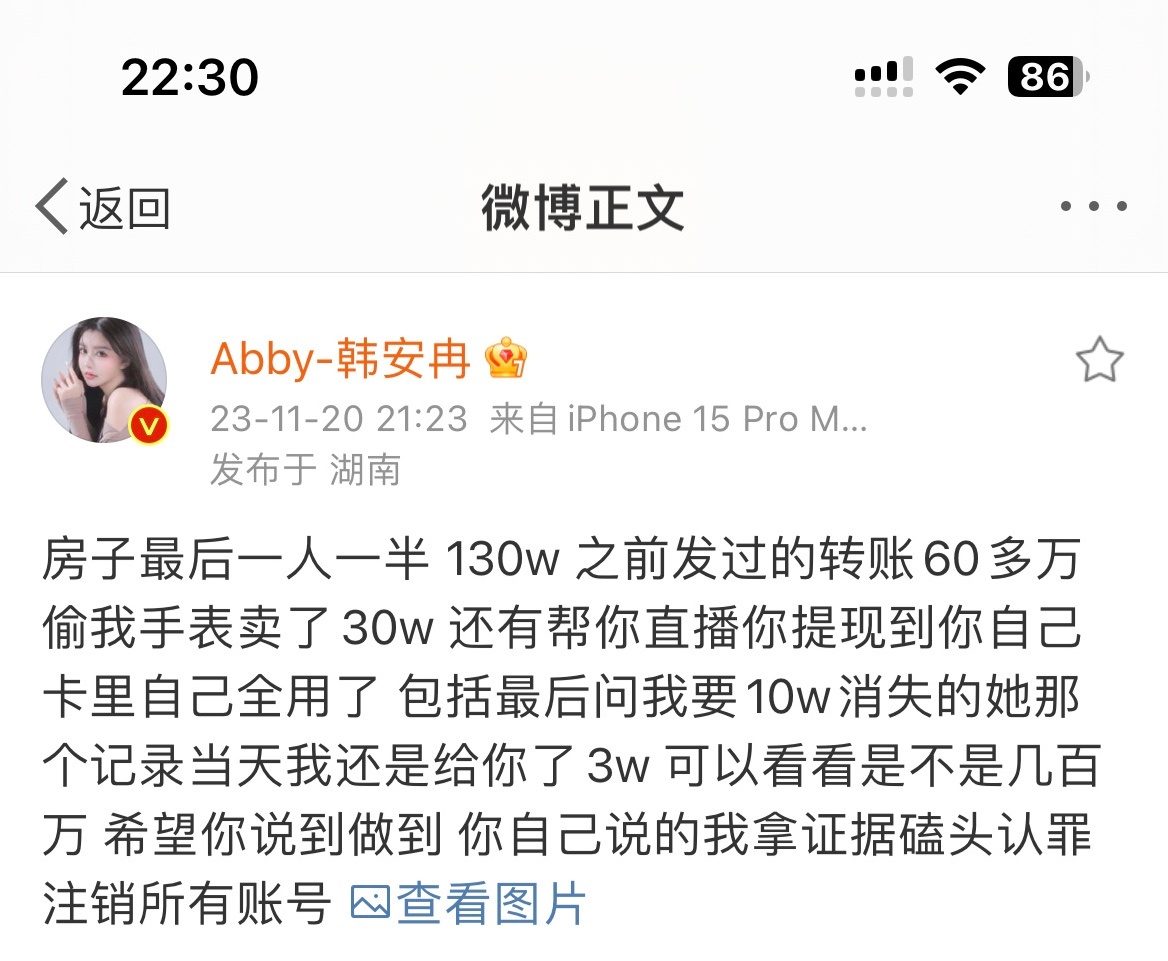 韩安冉:房子最后一人一半130w 之前发过的转账60多万偷我手表卖了30w,还有帮你直播你提现到你自己卡里自己全用了,包括最后问我要10w消失的她那个记录当天我还是给你了 3w!!这两人该信谁的话[允悲]#泽西喊话韩安冉#