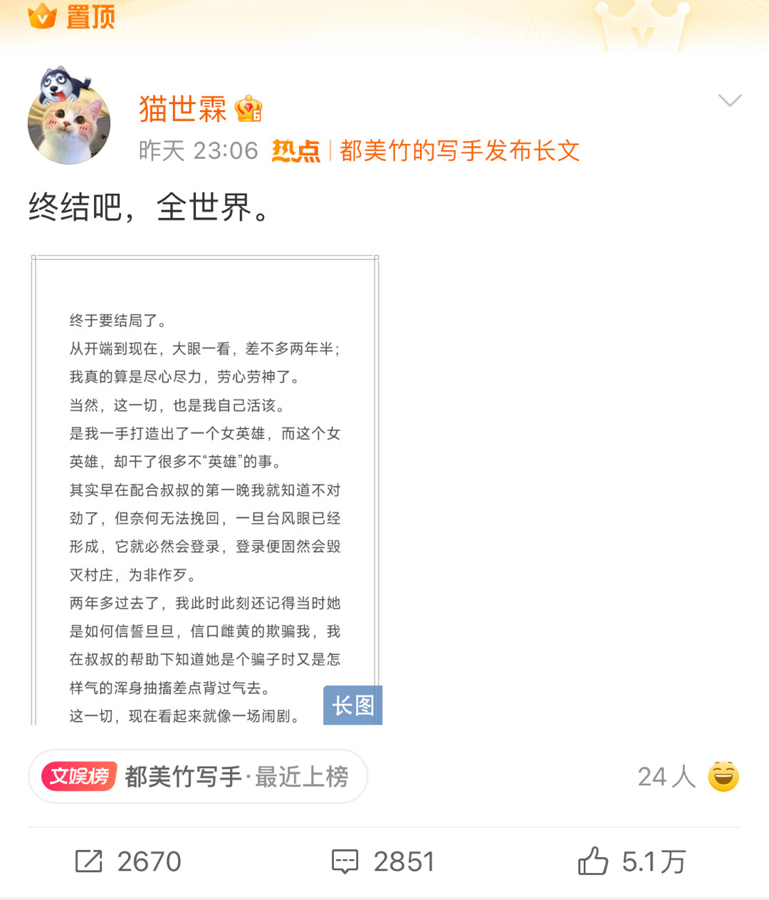 都美竹写手猫世霖发长文,惊天大内幕。大概就是写手这两年后悔了,因为dmz骗了他。都想利用wyf进入娱乐圈,因为进了就可以和秦牛一样什么都有了。