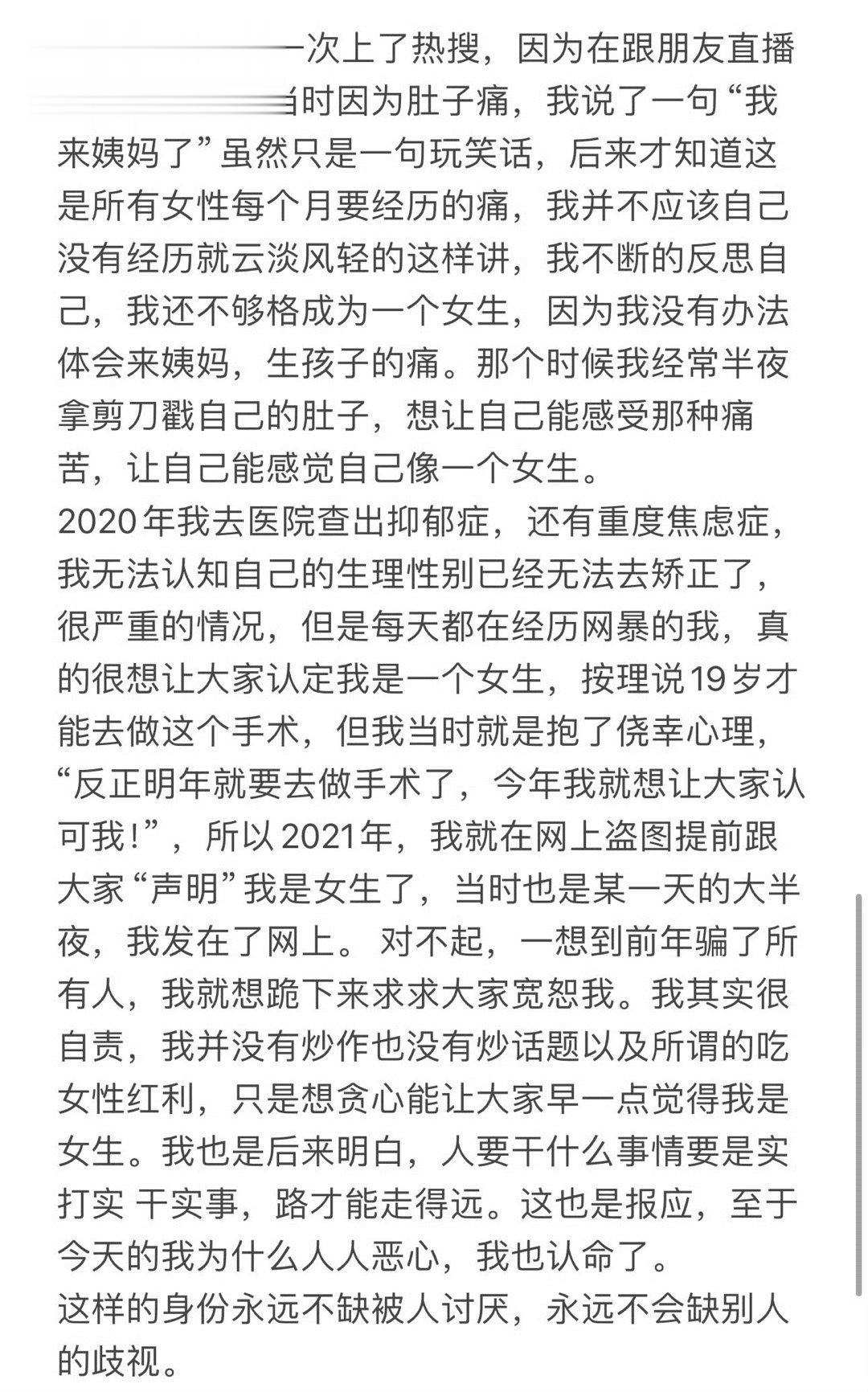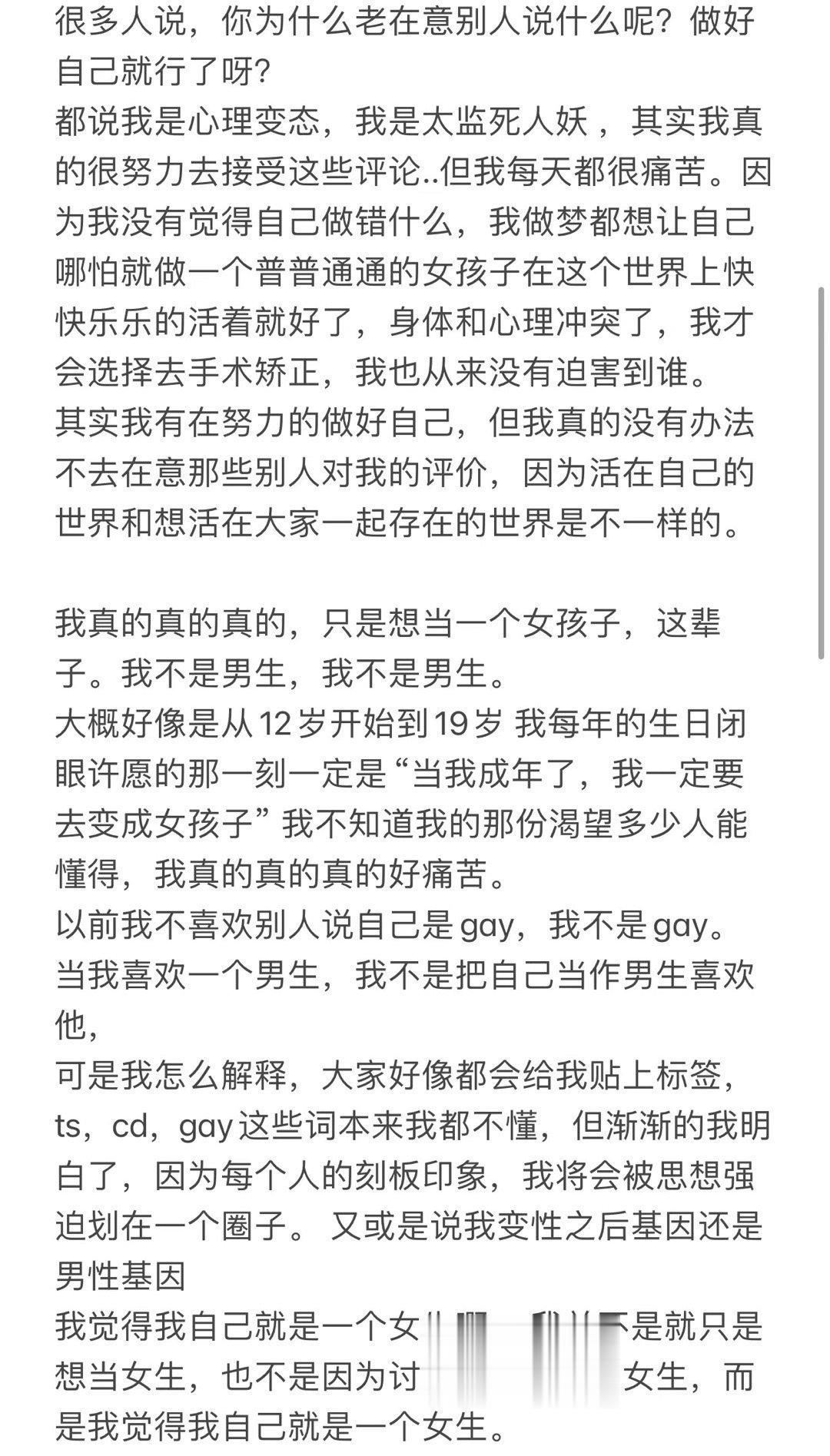 还讲述小时候记事起,就发现自己的心里是一个女孩,但的身体是一个男生。在读书时就被别人欺负,说她娘炮,从12岁开始到19岁 每年的生日许愿就是“成年了,一定要去变成女孩子”。