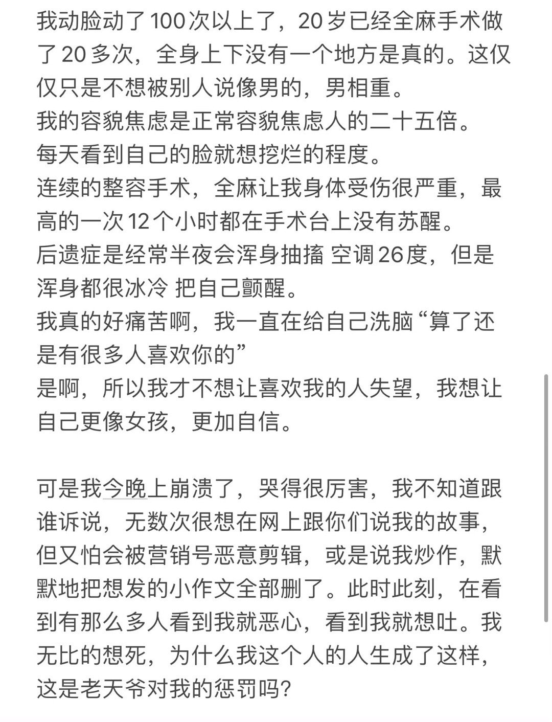 现在的她脸上已经动了100次以上了,20岁已经全麻手术做了20多次,全身上下没有一个地方是真的。这仅仅只是不想被别人说像男的,男相重。而且容貌焦虑是正常容貌焦虑人的25倍,连续的整容手术,全麻让我身体受伤很严重,最高的一次12个小时都在手术台上没有苏醒。后遗症是经常半夜会浑身抽搐。