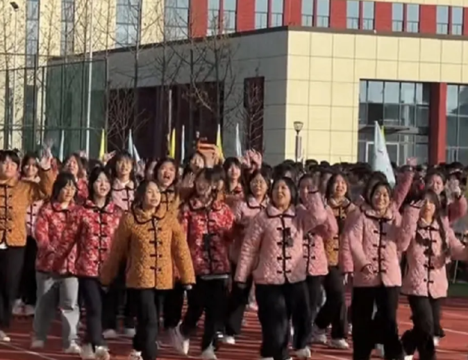 视频显示,先出场的是军大衣方队,看得出来,清一色的军大衣着装,让这个方队成为了场上的显眼包。而接下来出场的花棉袄更是让全场气氛来到高潮,清一色的女同学,清一色的花棉袄,更是让现场沸腾。不得不说,这军大衣和花棉袄之战真是各有千秋。