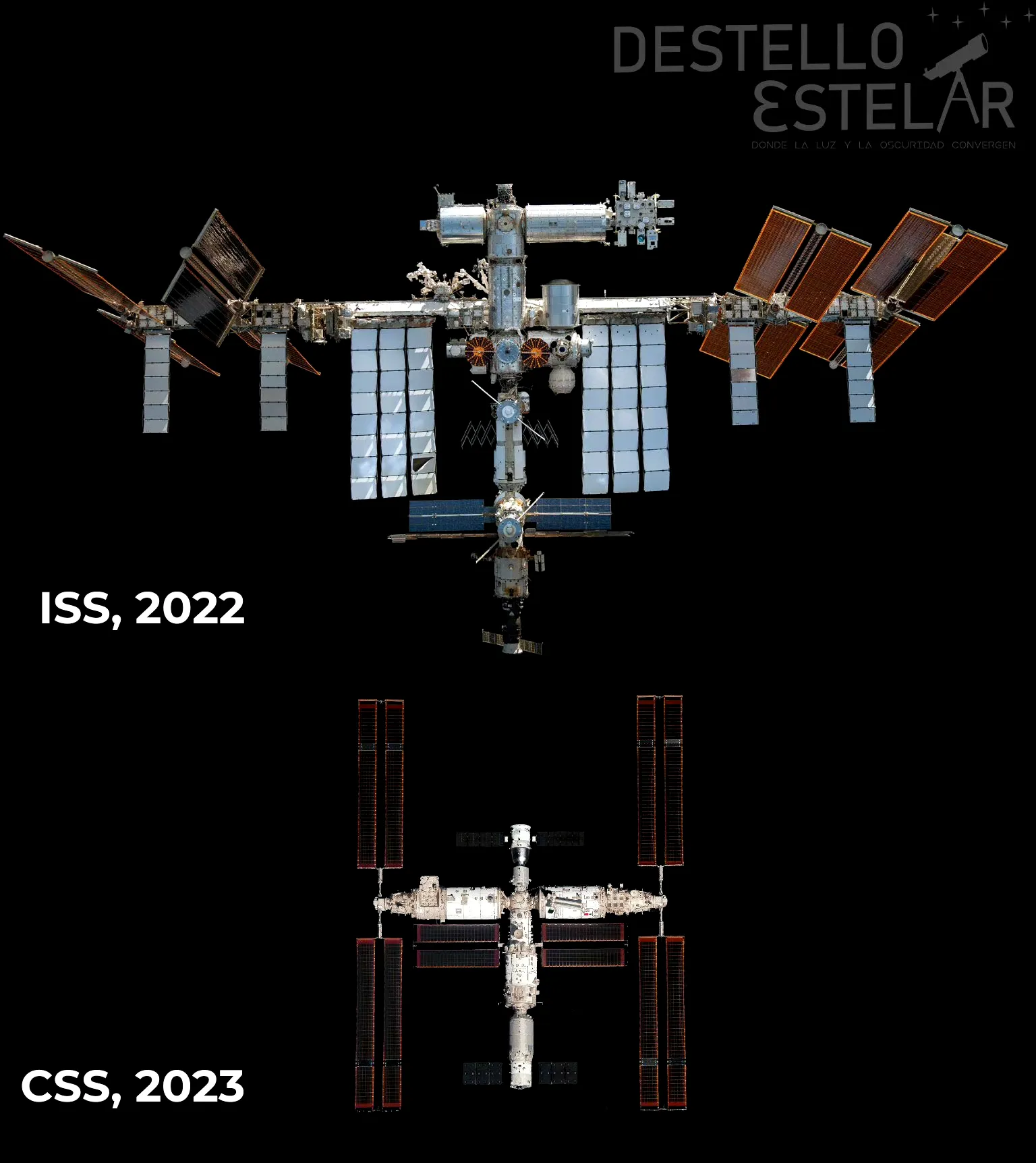 中国空间站(90吨级)与国际空间站(400吨级)同比例对比,其实两个空间站都是T字形构型,上面那一“横”都是为了布置大型柔性太阳翼。所不同的是,国际空间站是用桁架拉开太阳翼的间距,我们是通过舱体对置布局拉开太阳翼的间距,也都是为了减少太阳翼的光照遮挡,提高发电能力。
