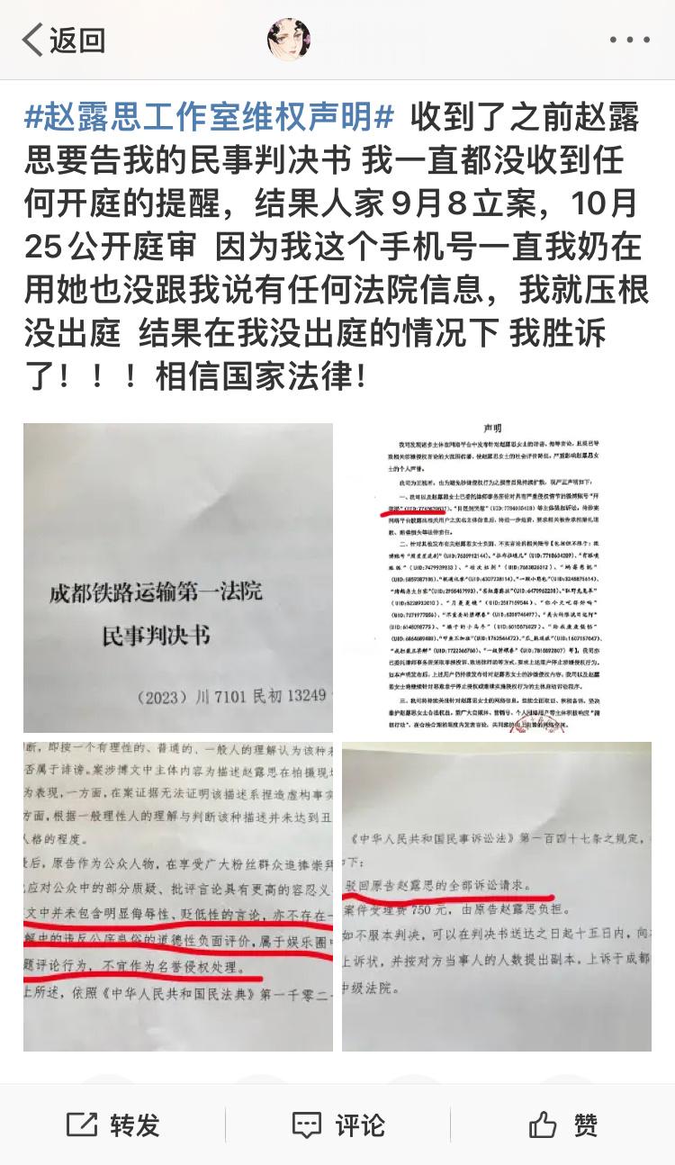 #赵露思败诉#今日下午有网友发了赵露思败诉的判决书:“我一直都没收到任何开庭的提醒,结果人家9月8立案,10月25公开庭审…结果在我没出庭的情况下,我胜诉了”