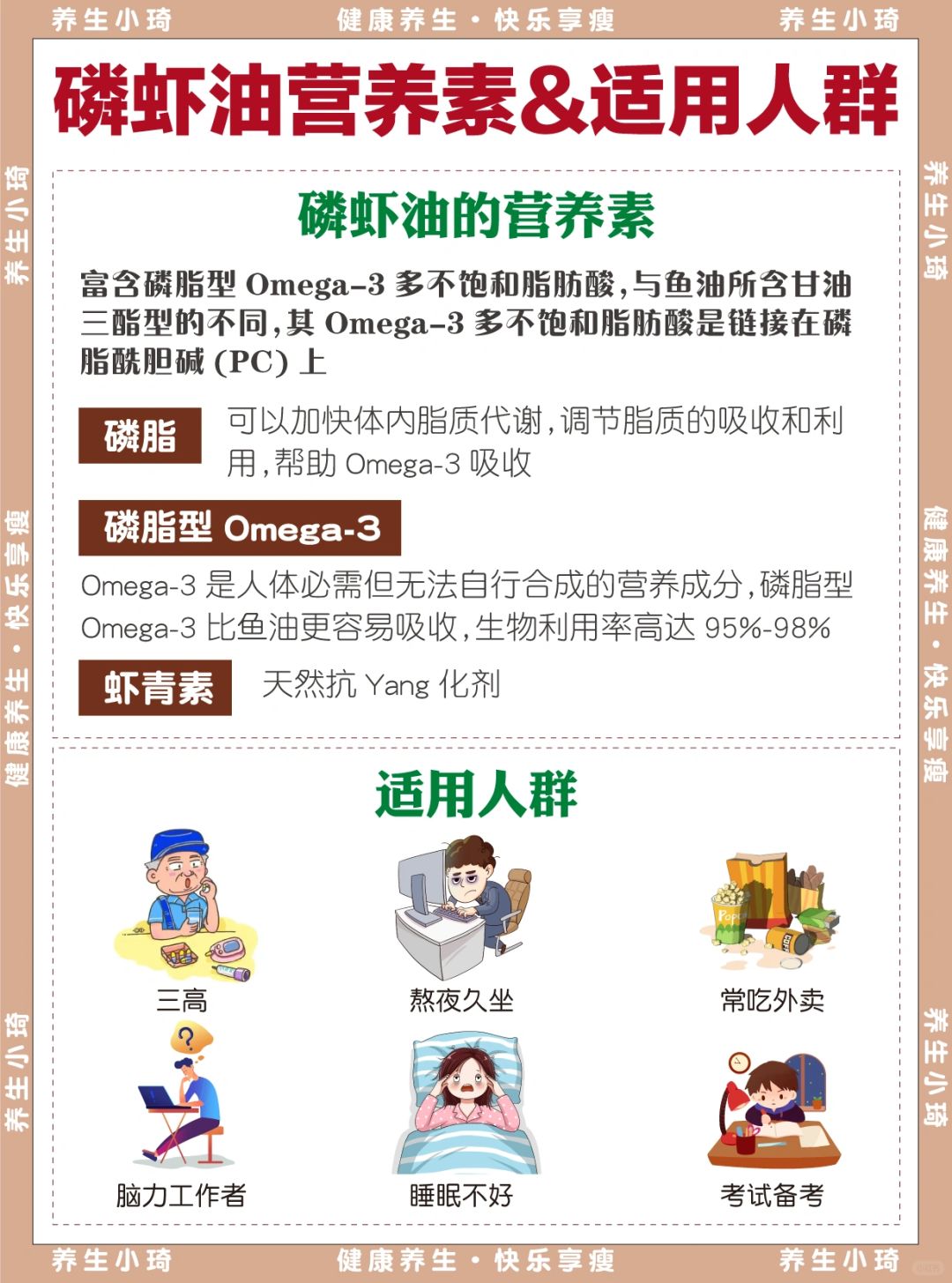 一粒磷虾油=鱼油+卵磷脂+虾青素,磷虾油中Omega3是磷脂型,吸收更好(生物利用率98%)