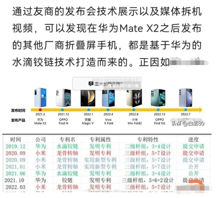 余承东说华为发明什么专利,友商改个名字就成他的了,于是小米急了,发文炮轰余承东。因为华为的水滴铰链是发明专利,而小米的龙骨铰链则是实用性专利,发明专利是首创,实用性专利是在别人基础上再做出来的东西,最后结果怎么样不重要,重要的是热度起来了。