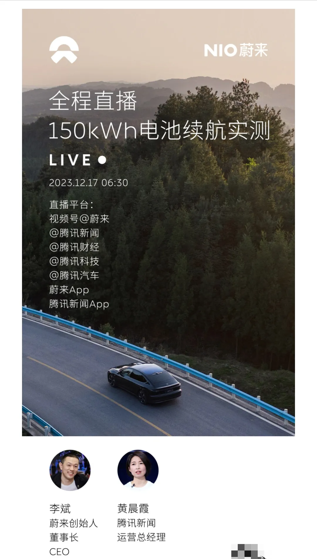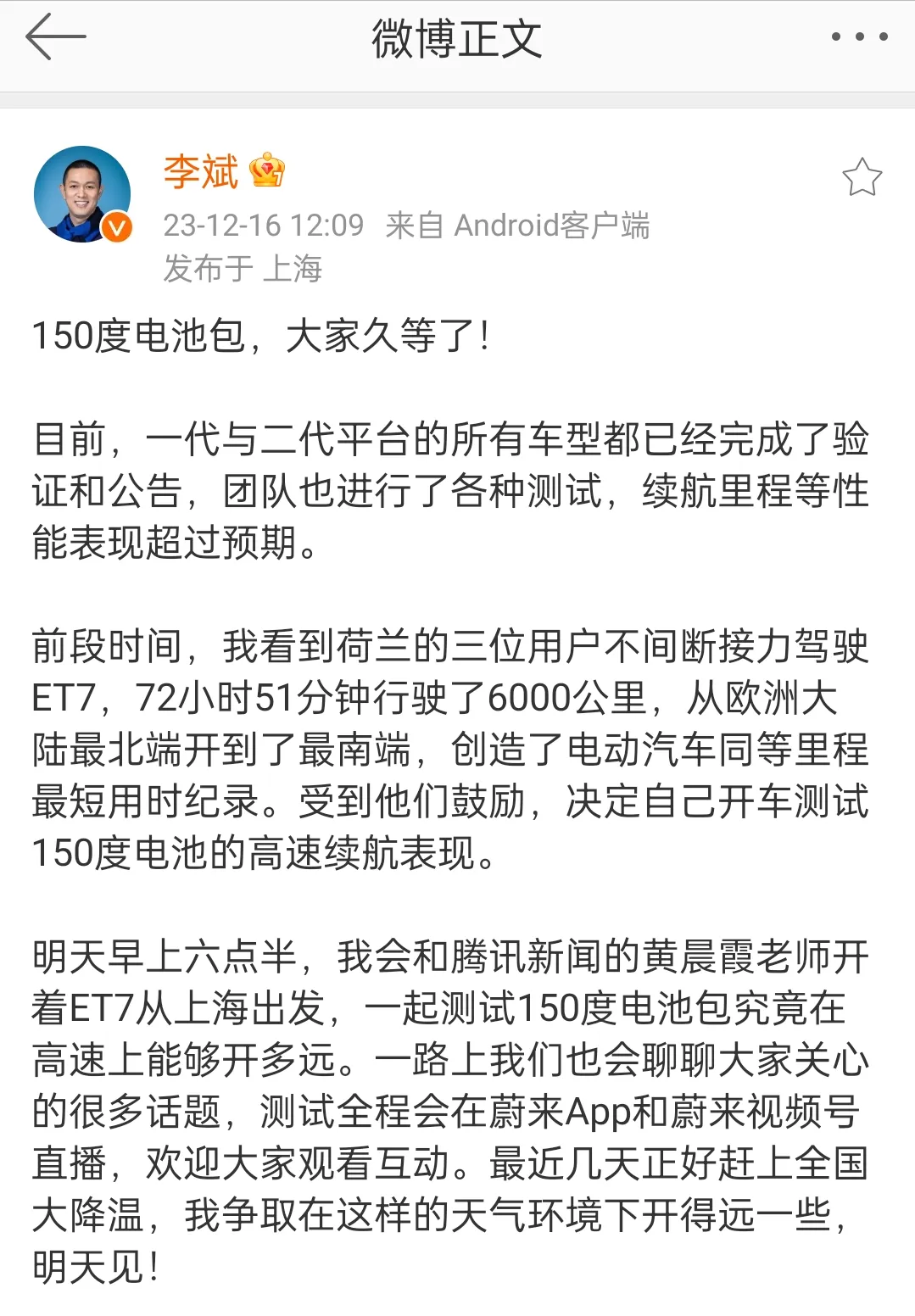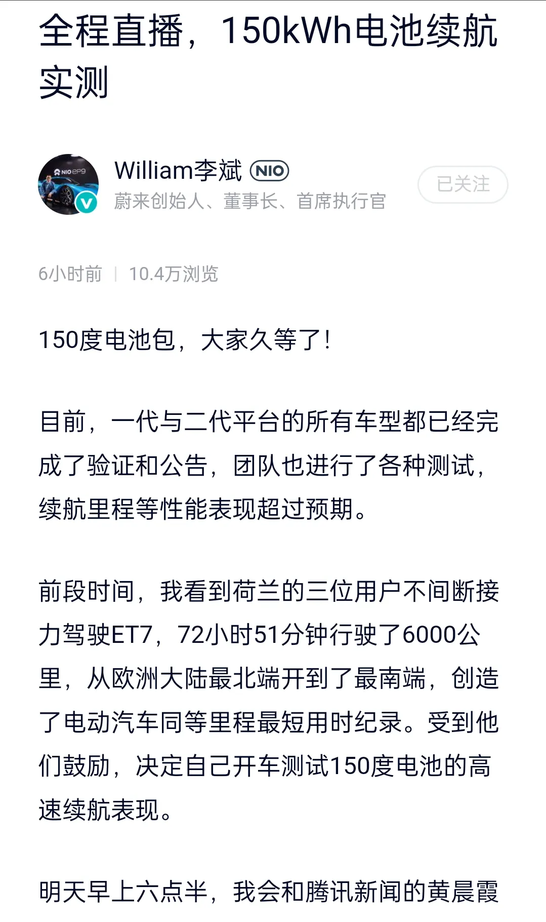 蔚来ceo李斌挑战连续开车1000公里,过程中不换电不充电,就用新推出的150度电池包,以90km/h的速度来开,但目前外界温度零度,肯定影响续航,但希望成功啊! 据斌哥说,其实若走广西路线,室外温度高些,则可以连续开1150km没问题的。