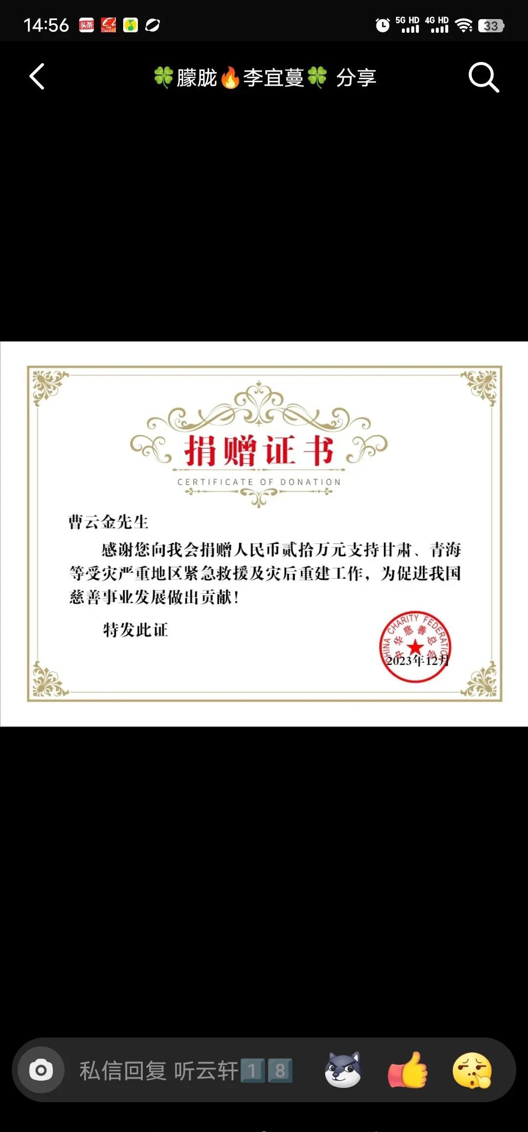 12月22日,相声演员曹云金否认“诈捐”:“得知甘肃地震,第一时间联系到中华慈善总会进行了捐款,数额是20万元整”,被造谣“诈捐”,表示“互联网不是法外之地,恳请网络监管部门还我清白”。 据悉,甘肃地震发生后,曹云金发视频称自己捐了20万,有网友却质疑曹云金的转账和捐赠证书不是一个人,甚至有网友表示,在中华慈善总会官网进行查询,发现不论是搜索曹云金还是曹金,显示出来的结果都是微信付款捐赠一元,引发网友质疑其“诈捐”。