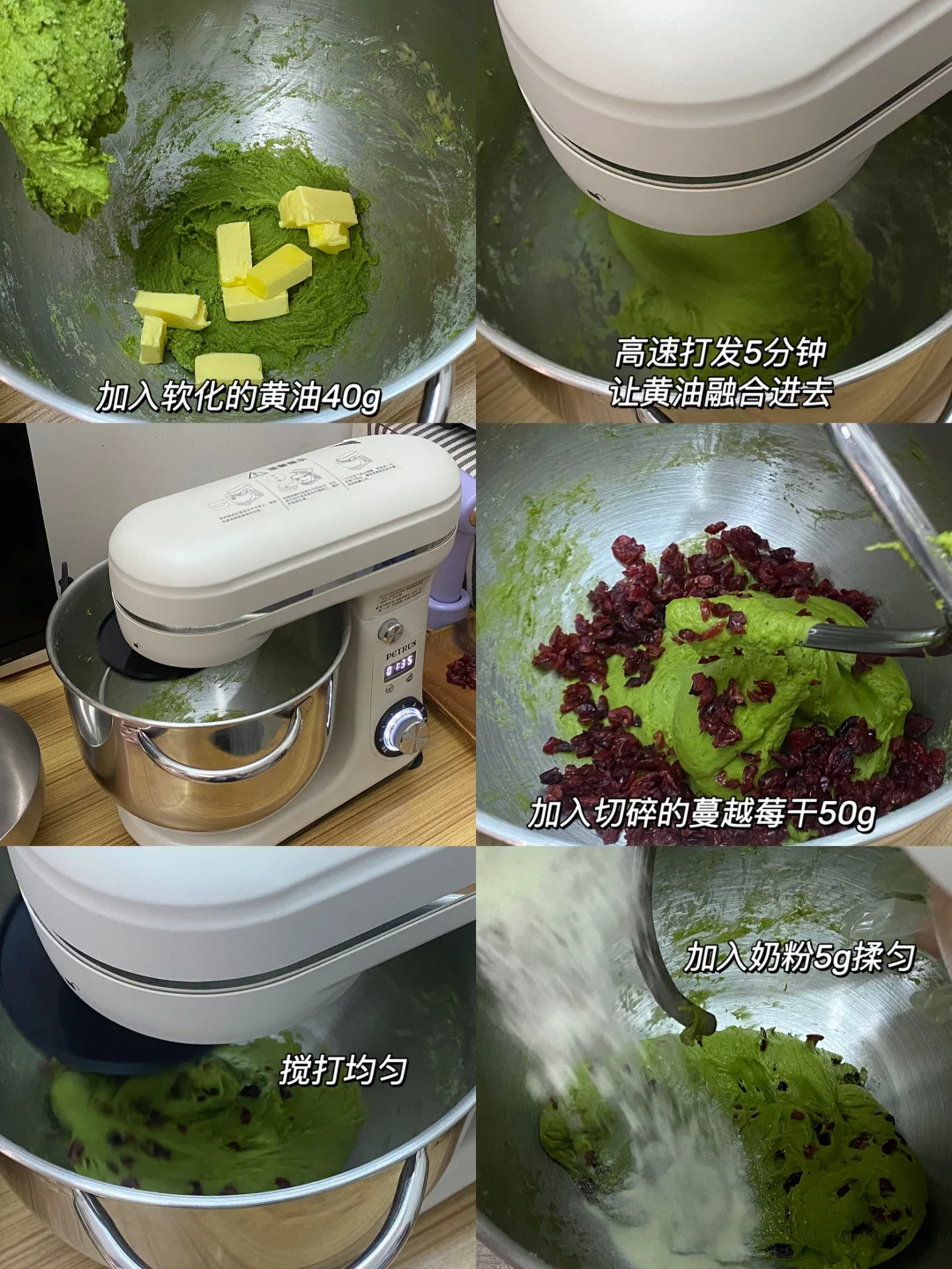 3.加入软化后的黄油,高速搅打5分钟,让黄油融合进去,加入蔓越莓干,搅打均匀,加入奶粉揉匀。