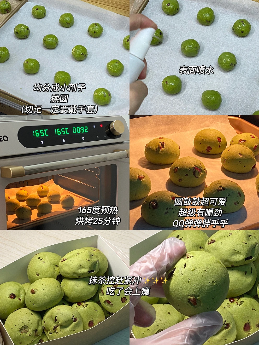 4.均分成小剂子,揉圆(切记一定要戴手套)放入铺了油纸的烤盘,表面喷水,165度预热10分钟,烘烤25分钟。