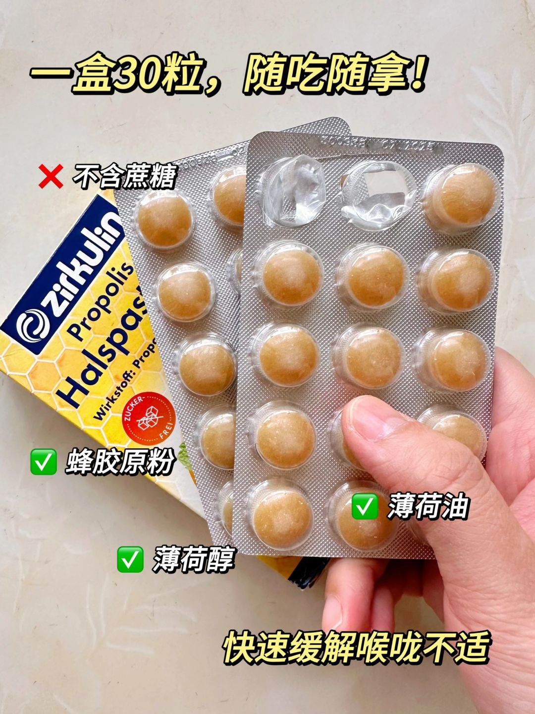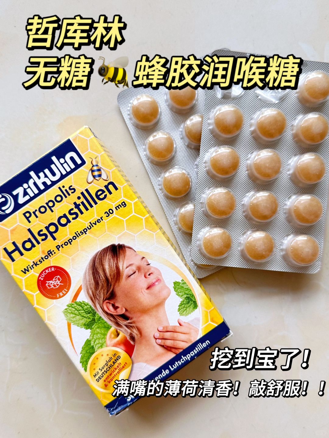 最近秋冬来临,各种BING毒肆虐,不少宝子都出现了“宝娟嗓”[失望R] - 4种喉咙不适的表现,你中了哪个? 咽喉干燥感:喉咙、口舌干燥 咽喉疼痛:疼痛或刺痛,吞口水特别明显 咽喉干痒:好像有蚂蚁在喉咙爬 咽喉异物感:喉咙有堵塞/异物感,吐不出去也咽不下来 - 6个喉咙养护指南⬇️ 多喝水 注意饮食 含润喉糖 盐水漱口 注意锻炼 让嗓子休息 - [向右R]说起润喉糖,真的要说说我的宝藏润喉糖哲库林了 每次喉咙要发作的时候,都会拿出一颗 清甜又润嗓!吃起来冰冰凉凉的超舒服![赞R] 主要成分就是蜂胶原粉、异麦芽糖酮醇、薄荷醇以及薄荷油 ❌麸质、❌乳糖、❌糖、❌棕榈油 五无!吃起来真的敲放心的! 容易喉咙不舒服的宝子们可以备起来哦~!