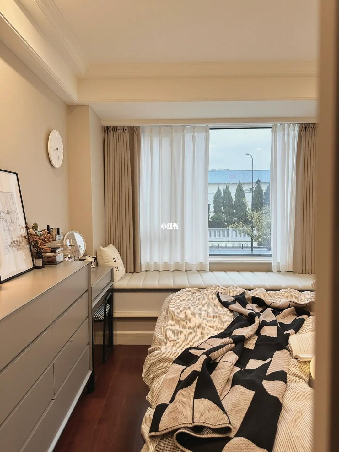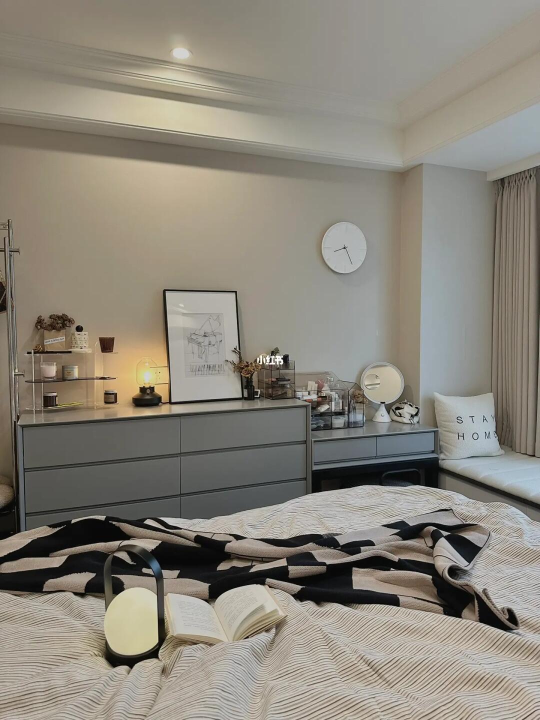 主卧同样猪肝红地板,搭配成黑白灰极简风。
