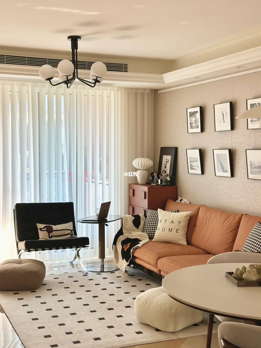 客厅暖色调搭配,白色⚪️和棕色🟤是基础,搭配少量黑色单品作点缀,增加空间层次感。