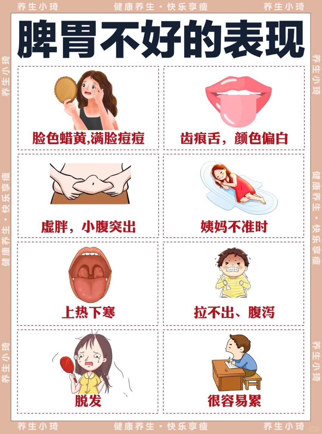 脸色发白、满脸痘痘、齿痕舌、虚胖、姨妈不准时、上热下寒、拉不出、脱发、很容易累
