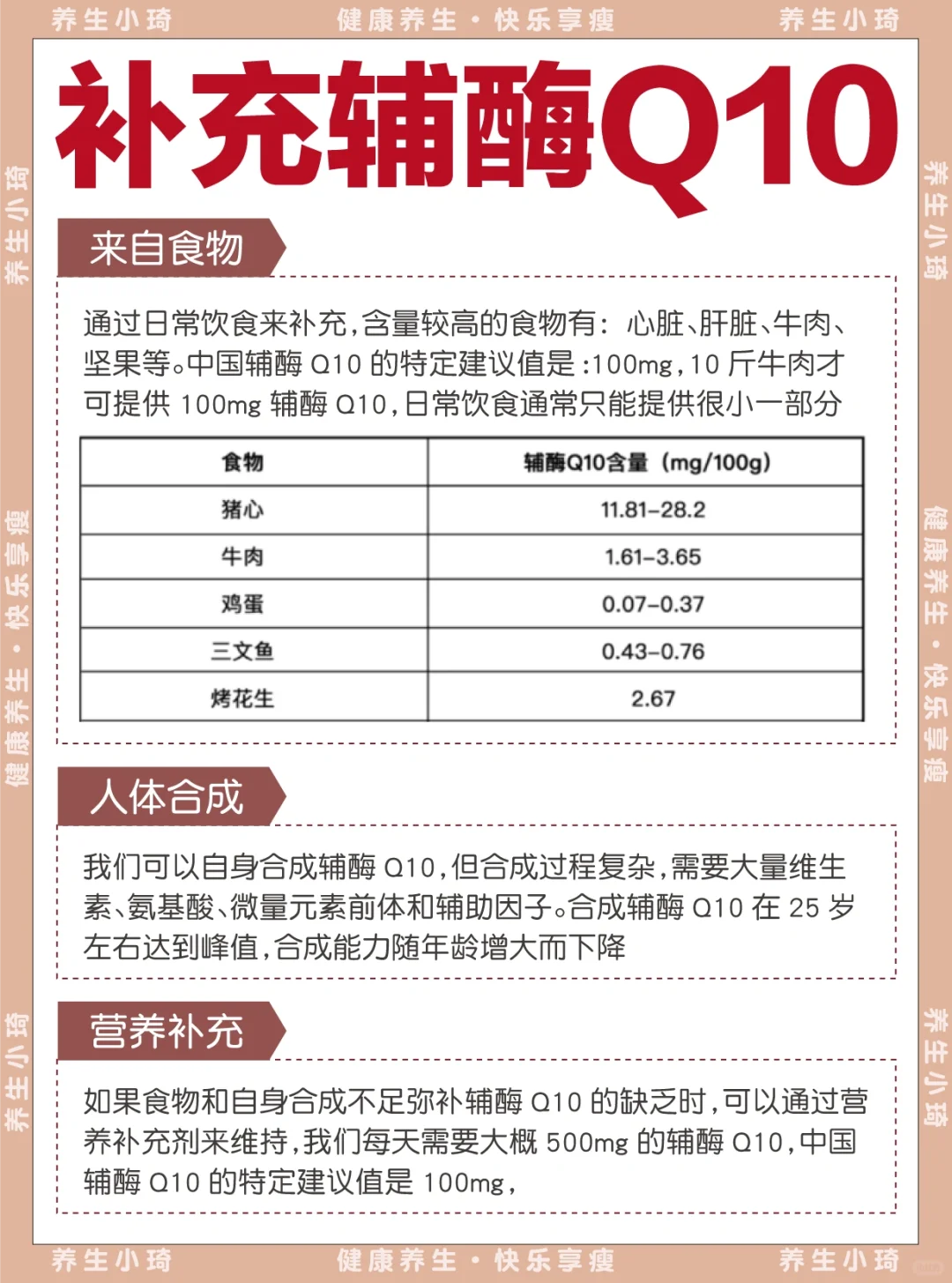 不少宝子由于工作、心理、压力等原因,不得不接受长期熬夜加班的生活 最近几年,猝S的新闻真的屡见不鲜[石化R] 一时熬夜一时爽,一直熬夜……就会胸闷气短、心律不齐、精神紧张,其实这些都是身体在提醒你,真的不要再熬了!!![失望R] 我身边不少熬夜的同事都开始意识到这点,已经开始改变了,辅酶Q10也成了他们的心头爱 - [清单R]辅酶Q10作用 让心脏更有力,提升心肌能量,缓解熬夜后疲惫感 [清单R]辅酶Q10的来源 [一R]来自食物:含量较高的食物如动物心肝脏、肉、鱼、坚果等,但日常饮食只能提供很少一部分 [二R]人体合成:合成辅酶Q10过程较复杂,需要大量维生素、氨基酸、微量元素前体和辅助因子,合成能力随年龄增大而下降 [三R]营养补充:当日常饮食和自身合成不足时,可以适当使用补充剂来帮助 - [清单R]如何提高辅酶Q10吸收率 [一R]软胶囊比硬壳胶囊更容易吸收 [三R]辅酶Q10高亲脂性,建议和带油脂的食物一起吃 [三R]晚饭后服用可以提高利用率 - [向右R]我和身边熬夜的同事选的是Noromega辅酶Q10 要知道中国辅酶Q10的建议值是100mg 它每一颗胶囊就有100mg的辅酶Q10和50mg的卵磷脂,每天一粒刚刚好 而且Noromega辅酶Q10还是通过发酵提取,不是人工合成的~ 每罐有90粒,每天一粒刚刚好~ 💡Tips:因为辅酶Q10是脂溶性营养素,随餐服用或是午餐后30分钟内吃比较好! 如果大家有感觉到经常性加班熬夜压力大,真的可以备一瓶在身边!