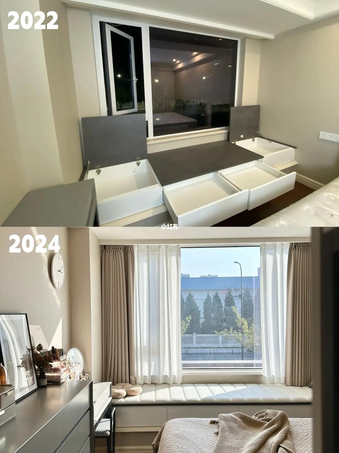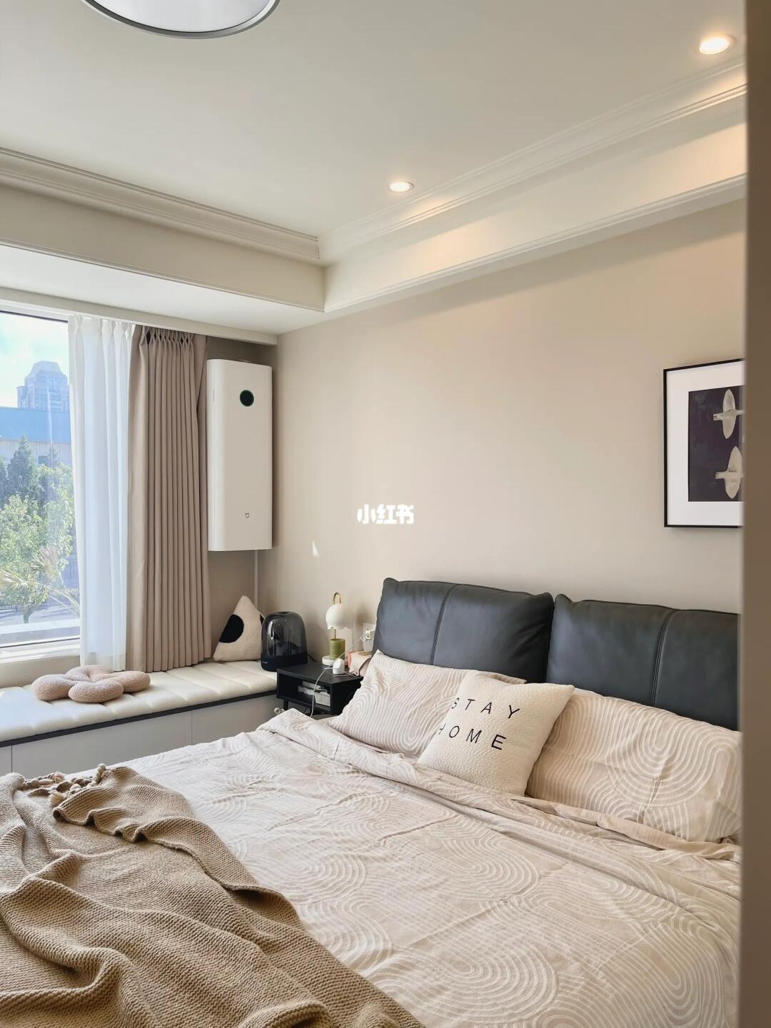 飘窗垫+窗帘+四件套这类布艺软装和壁布统一色系,