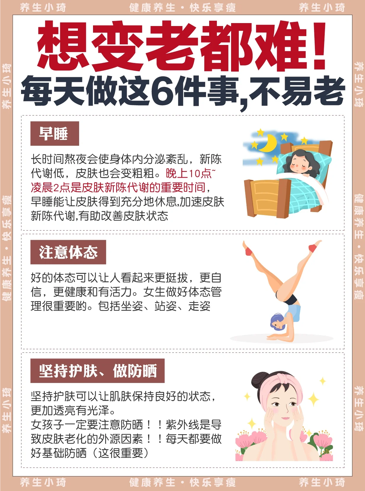 [失望R]hin多姐妹满脸痘痘,脸黄黄,用了很多东西都依然没效果 [气球R]姐妹们要知道,美貌的尽头是养生!![气球R] 每天做好这6件事,享满30-10!!! [一R] 坚持睡前泡脚 [二R] 每天午睡 [三R] 保持良好的心态 [四R] 早睡 [五R] 注意体态 [六R] 坚持护肤、做好防晒