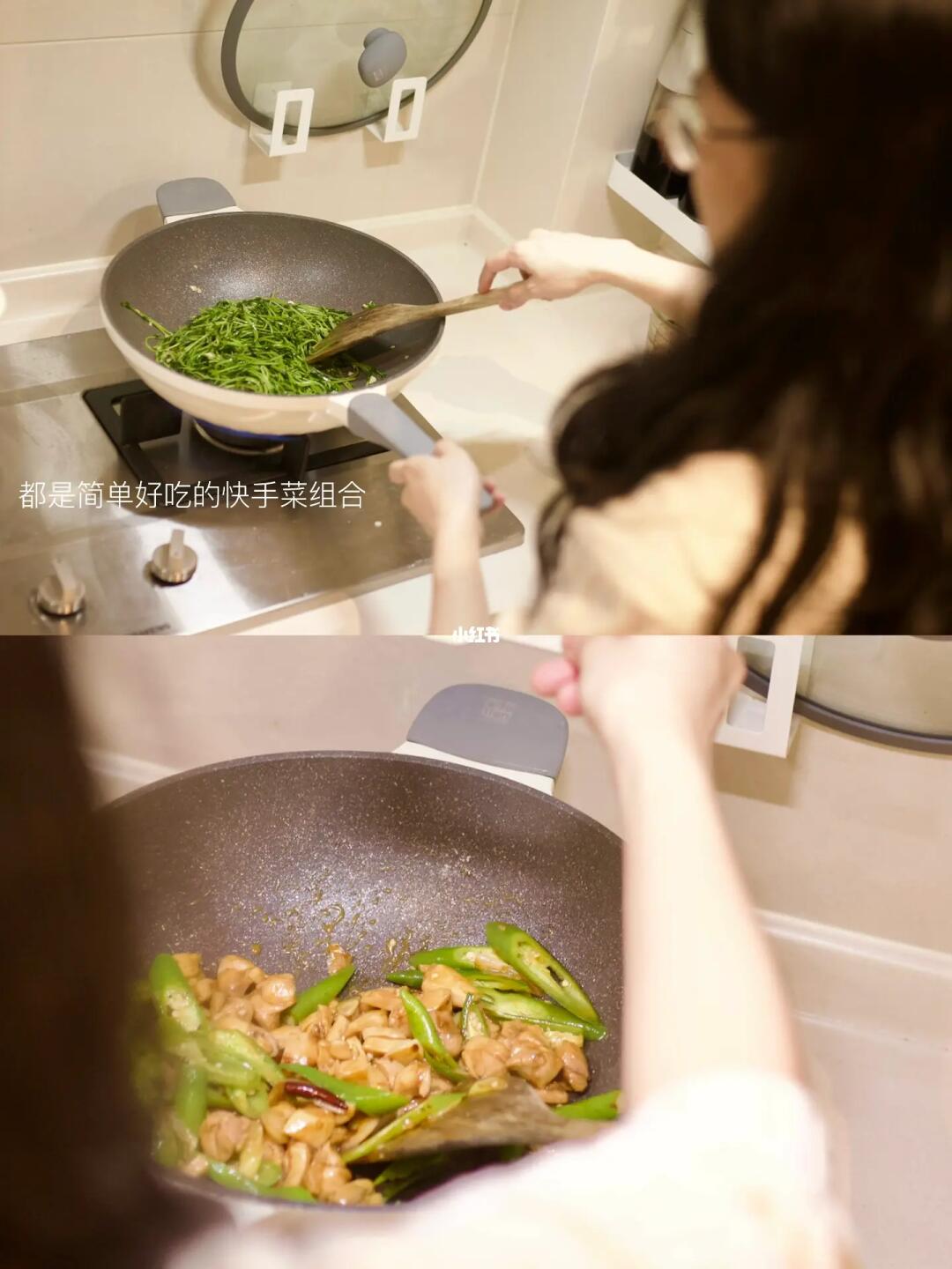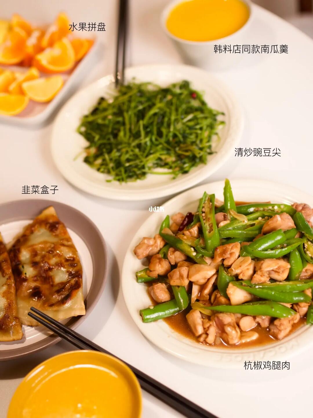🍴 两个上班族约定在周中至少开一顿火, 昨天下班回到家两人餐做好都快9点了, 饥肠辘辘却让这顿饭更加期待。 下班回到温暖的小家真的好幸福💗 🍴 平时里的食堂,周末的大餐, 好像在家做饭的机会少只有少。 简简单单的南瓜汤+韭菜盒子 杭椒鸡腿肉+清炒豌豆尖, 切点喜欢的水果搞个拼盘, 半个小时搞定的晚餐, 却这一刻味蕾得到极大满足,吃着舒服又暖心。 家里的烟火气也在这一刻更加热烈而浓郁。 喜欢的家的日常大概就是这个样子吧。