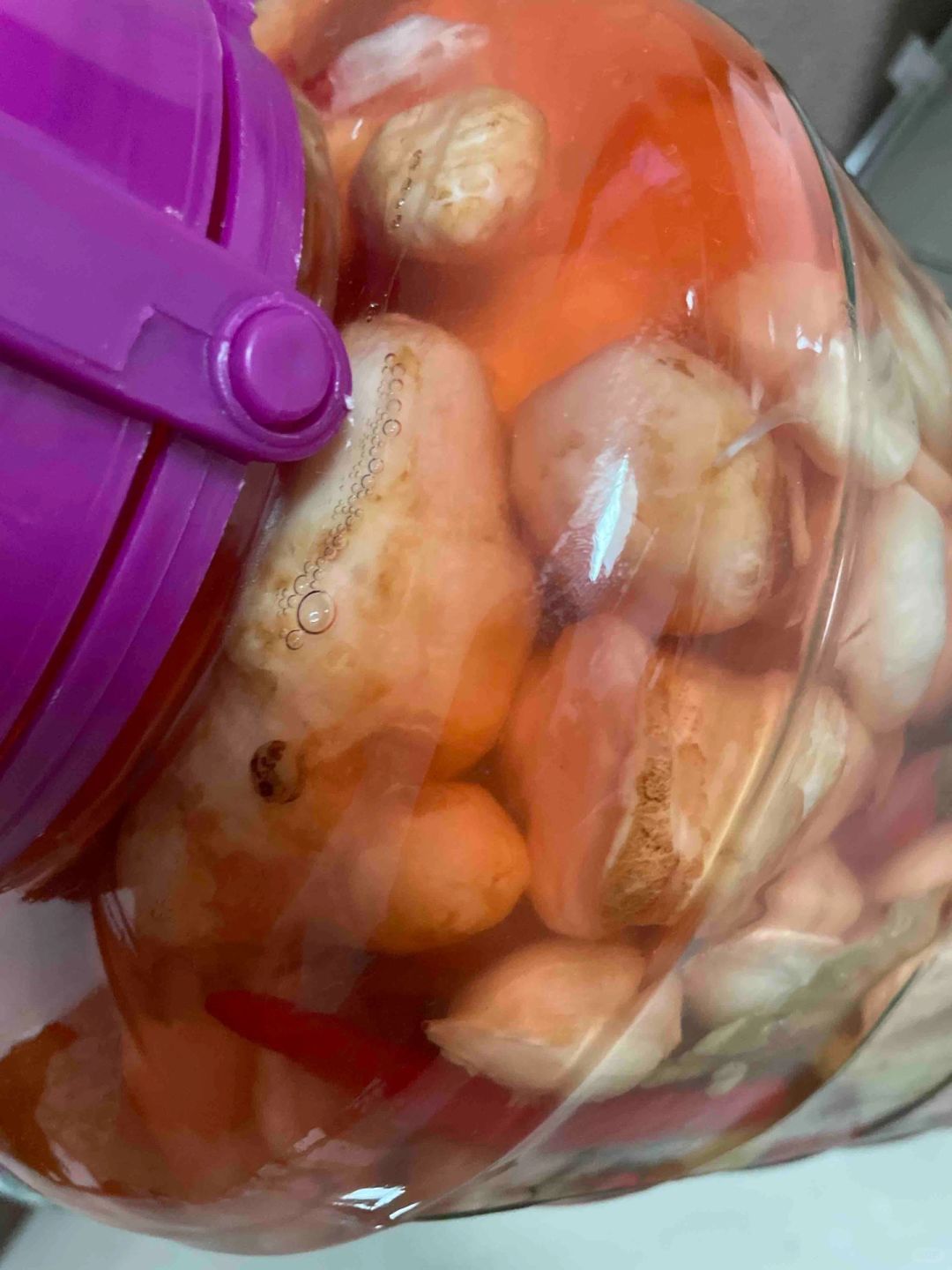 图2的泡泡是在发酵,属于正常现象。 图3是微生物沉淀也不要担心,最后都会沉淀到坛底,如果坛底沉淀过厚就换一个干净的坛子消杀完把表面清澈的泡菜水先倒进去,再把菜放进去。原坛里的微生物沉淀倒了洗干净备用就可以,我一般是一年多两年的样子倒一次坛子。