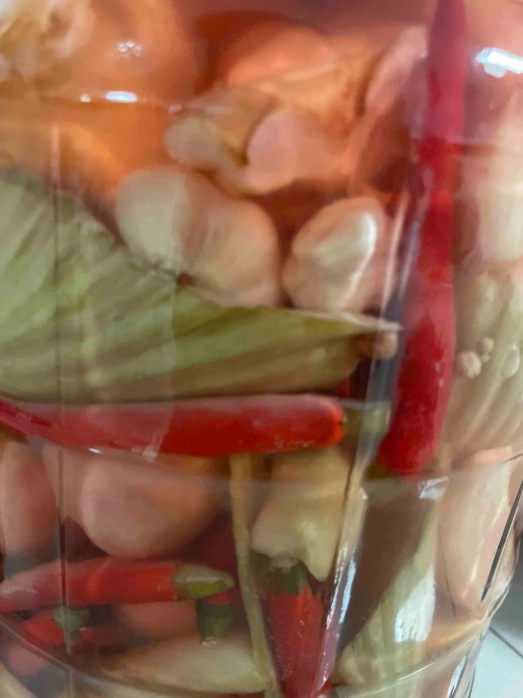 具体操作以及注意事项: ①准备好要泡的菜洗干净,晾干水份,菜的比例无所谓,一袋500克的泡椒(2.5RMB左右)。 ②准备一个无油的锅(我有时候偷懒直接用烧水壶煮),洗干净的花椒八角香叶煮水,晾凉凉的透透的那种。 ③泡菜缸子洗干净了晾干,晾干以后用56度高度白酒倒进去在里头晃晃晃,不着急用就晾干,着急用也可以用干净的餐巾纸擦干净。 ④洗净手擦干或者戴个一次性手套把晾干水分的菜加进去,然后把泡椒水+晾凉的水倒进去(我爱吃小米椒不爱吃泡椒所以只加泡椒水),第一次泡尽量塞满到离瓶口两个指节的位置(避免空气太多),我这是8升的罐子,黄糖大概我的手大半个拳头那么多,盐250克左右。 ⑤戴个一次性手套,倒点高度白酒在手上给坛口内侧抹一圈,盖盖子收工等吃。平时拿取无所谓,但是每次加菜之后一定要在瓶口抹一圈酒做消杀,每次加菜也一定要洗干净以后晾干水分再加入。