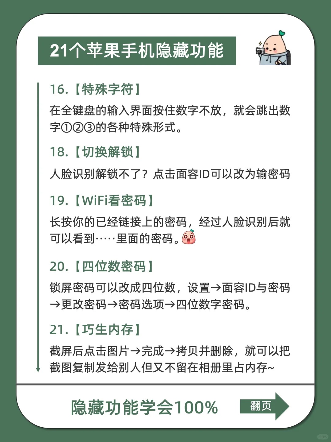 仅1%人知道的21个苹果隐藏功能㊙️不会=白买 用了这么久的iPhone你真的用明白了嘛~ 今天给大家带来了21个苹果隐藏功能,每一个都嘎嘎实用 如果你是资深果粉,那就测试一下这21个隐藏功能你知道几个?全都知道的话就算你厉害 刷到就是赚到,手机效率提升杠杠滴,赶紧起来,别想用的时候找不到啦!