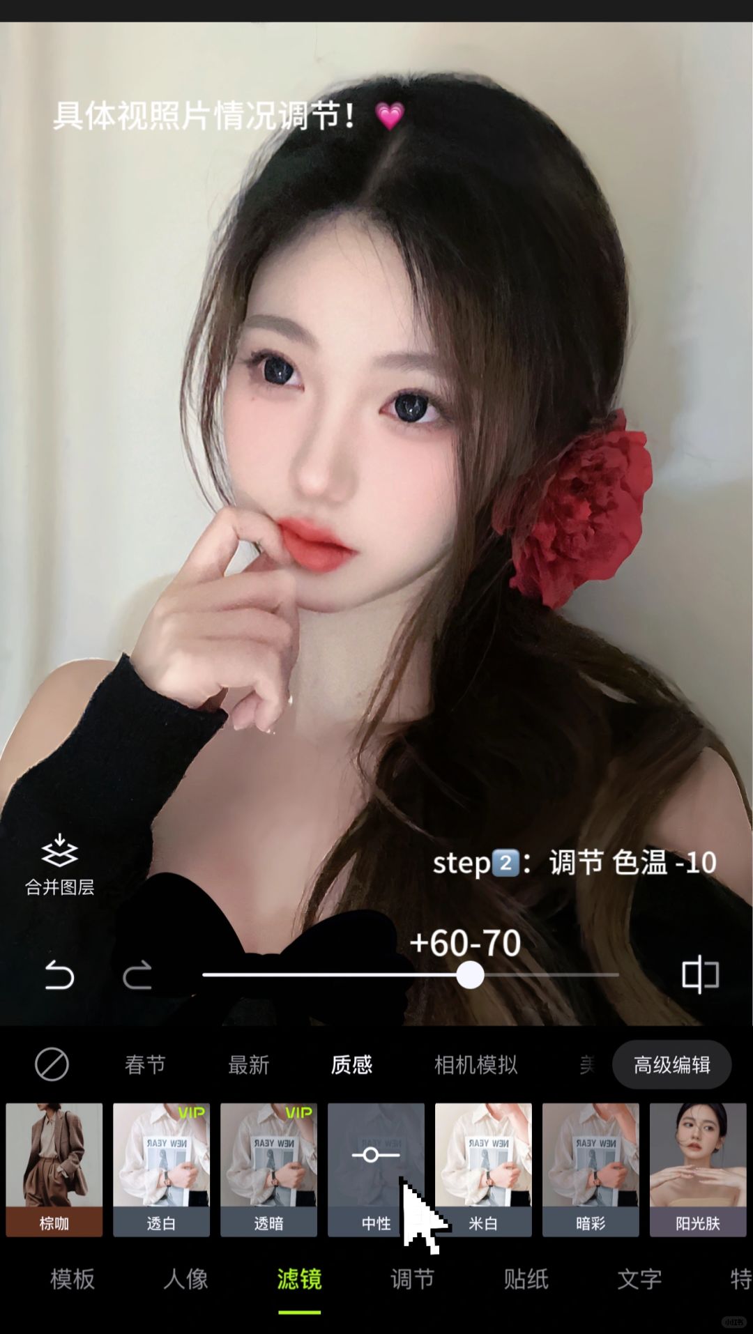 最后用眨眼画质修复了两次🫶🫶 中性这个滤镜真的神了! 肤质变好,阴影面和亮面的对比度也高了,立瘦10斤!哈哈哈