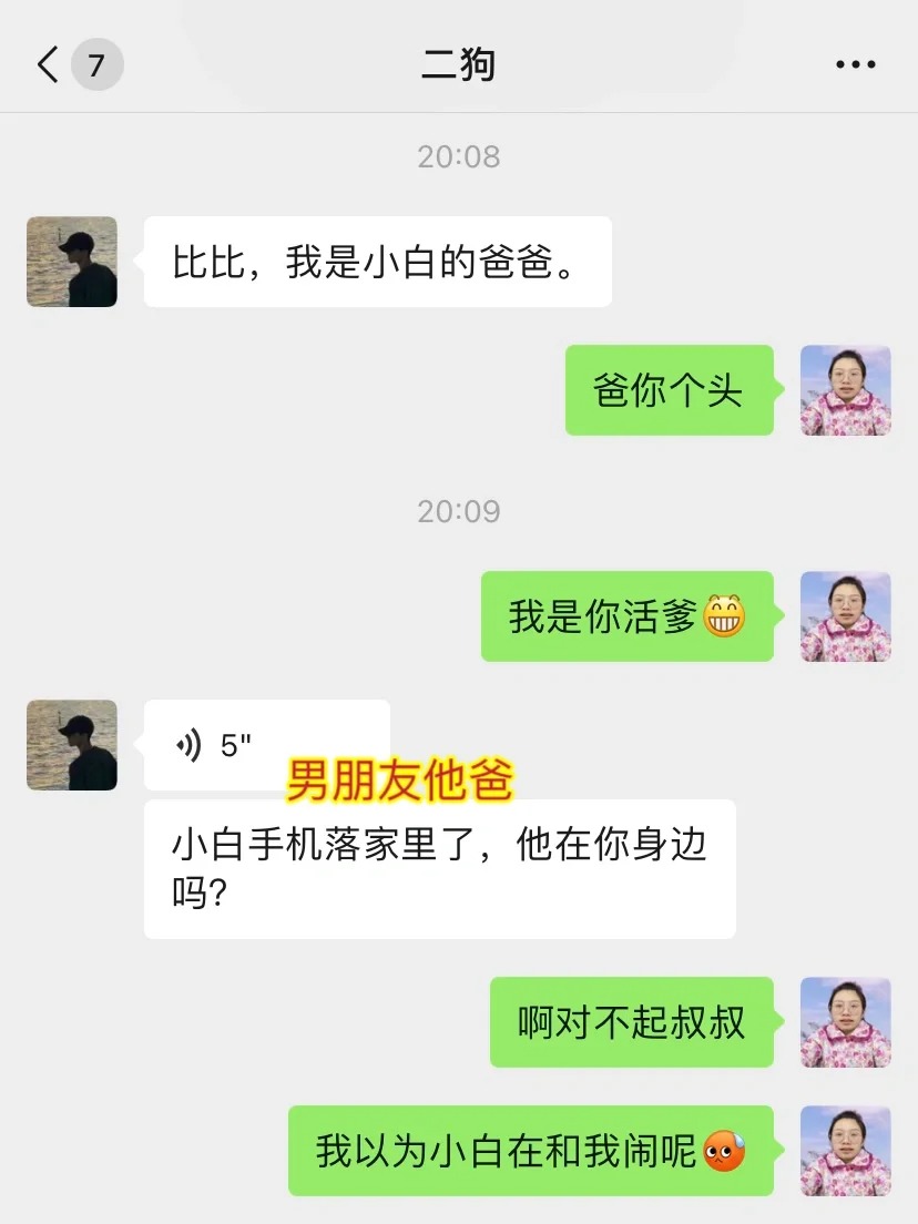 把男朋友爸爸当成男朋友大放厥词🙏 我真的要叫救命了,把未来公公当成男朋友自称是他爹已经够社死了!谁能想到我这个小脑筋在快速运转之后,灵机一动想出给男朋友打电话这个小妙招😅我说呢打了八百个都没人听,合着他爹一直对着手机无所适从,直到看到我亲切问候的短信不得不回复🙏现在男朋友是找到了,我们俩的未来彻底迷失了🚬