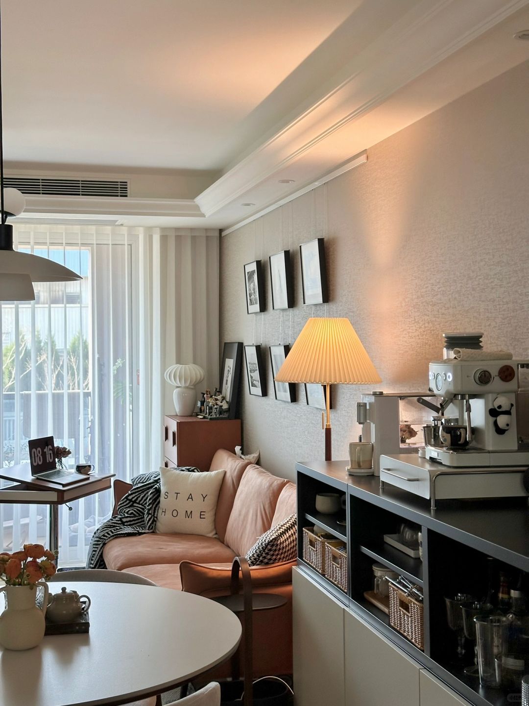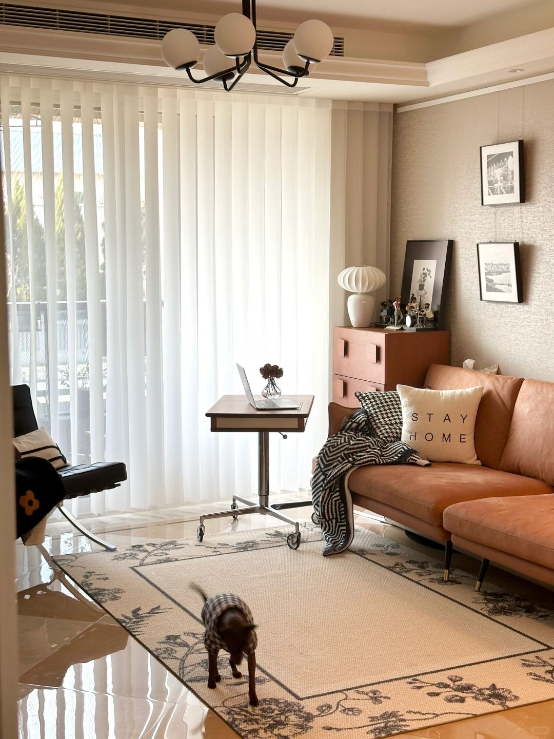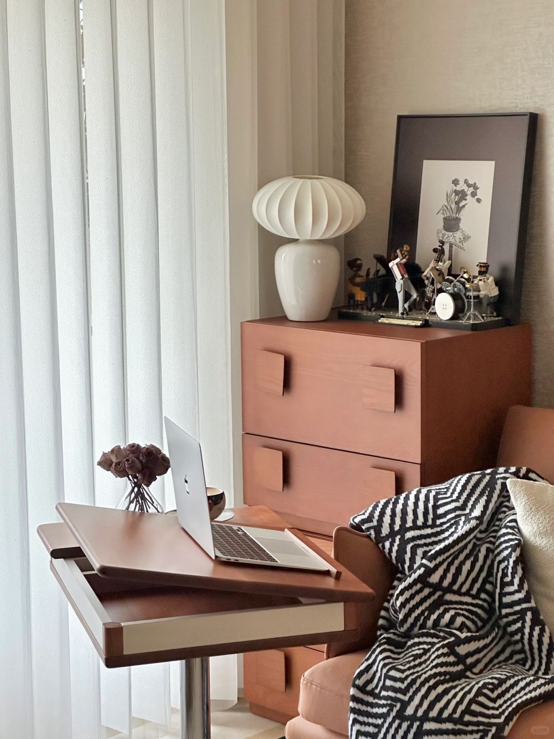 ✔️没有摆放茶几,沙发旁边放个升降边几还能办公。