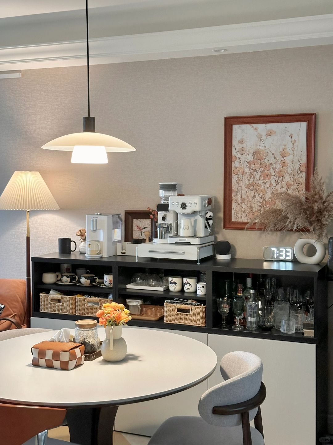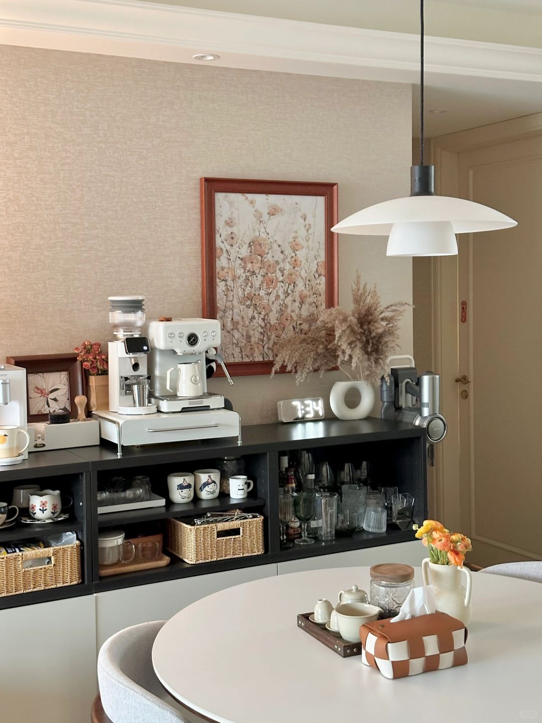 ✔️餐边柜布置了咖啡角,开放格用藤编框收纳小物件和喜欢的杯子。