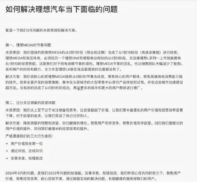#李想内部信复盘MEGA问题# 信很长,省流版: 1、承认MEGA到现在为止,并不成功。 2、应该抱着空杯心态做MEGA,而不是建立在以往销量战绩肩膀上,步子跨得有点大。 3、过分关注销量,有些偏离用户价值这一安身立命之本。 4、知道错了,马上改。 【来自懂车帝车友圈】