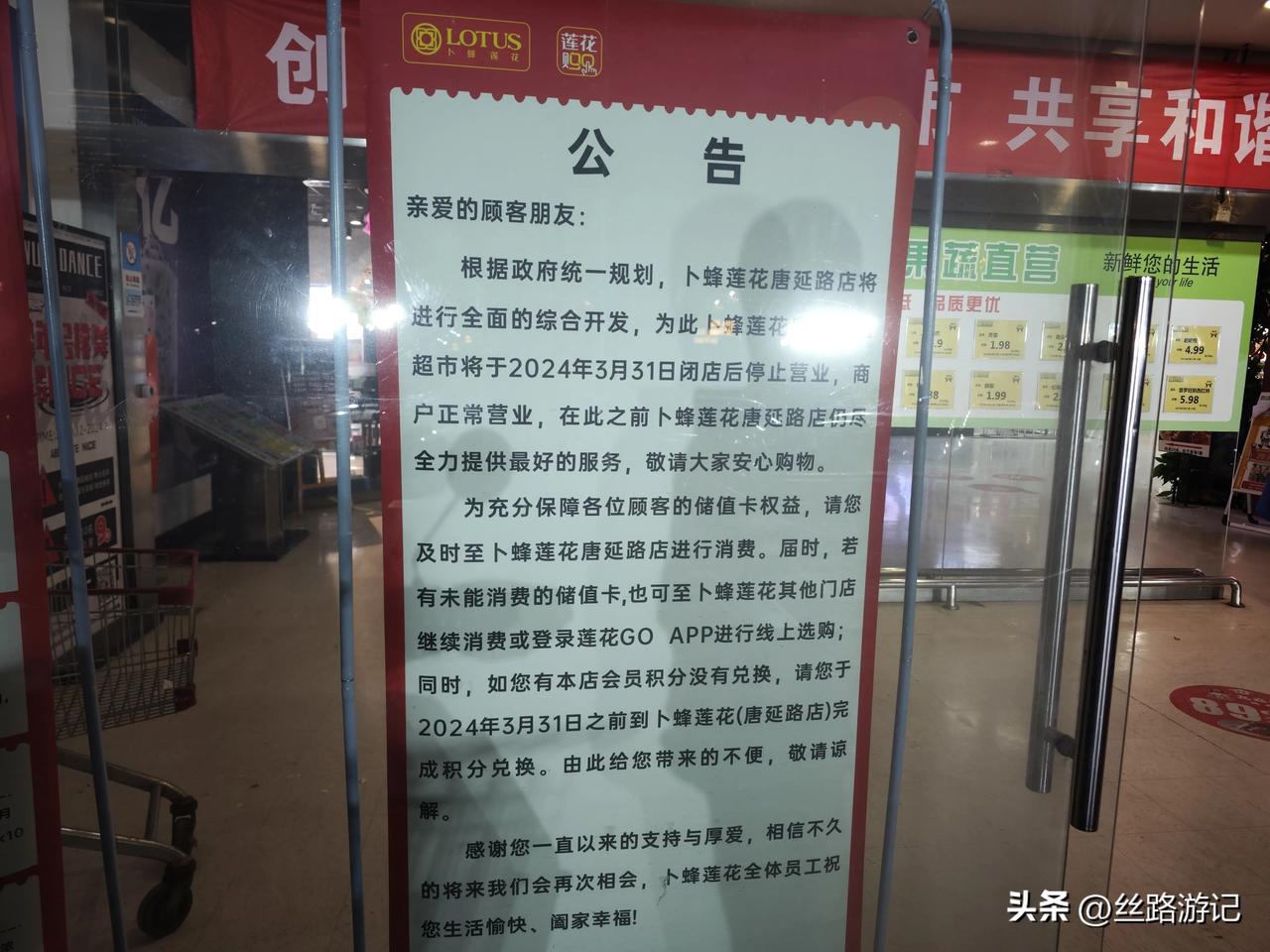 2004年7月,西安最大超市易初莲花(现名卜蜂莲花)唐延路店正式开业,这是泰国正大集团在西北地区投资的首个大卖场,也是西安最早的外资超市之一,到现在营业近20年,已经很长时间没去过这个超市,前几天路过,进去看看,没想到门口贴出停业通知,营业至3月31号就要关店,看来生意确实不行,不光是卜蜂莲花,还有沃尔玛,大润发这些巨头在西安门店的人气都不行。